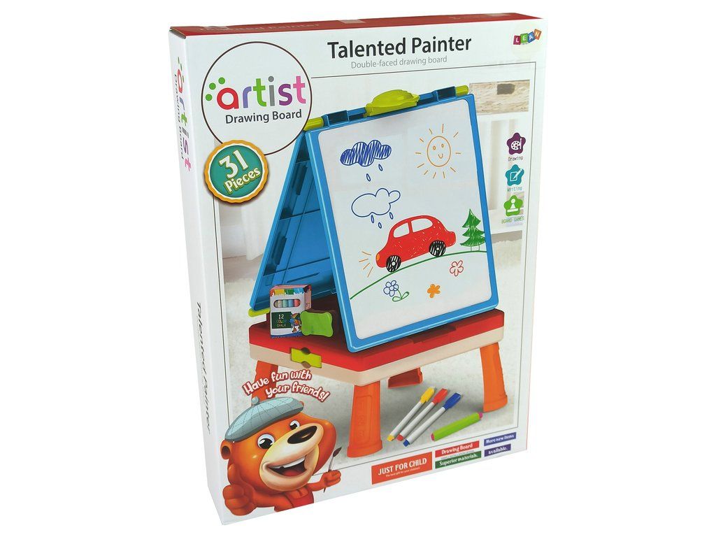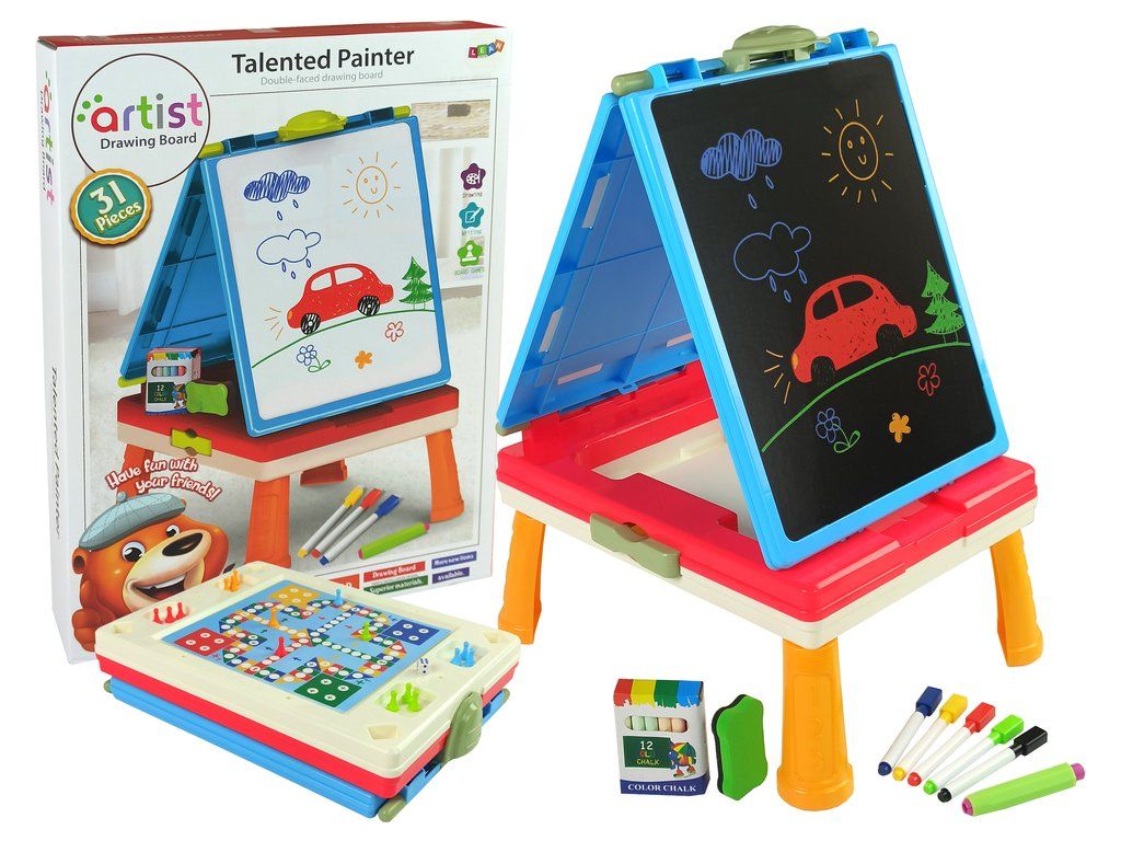 Spousta výhod, ale jeden výrobek. Tabule má dvě kreslicí plochy - bílou pro použití stíratelných fixů a černou pro použití kříd - a dodává se s fixy v černé, modré, červené, zelené a žluté barvě. Také se sadou 12 kusů kříd.