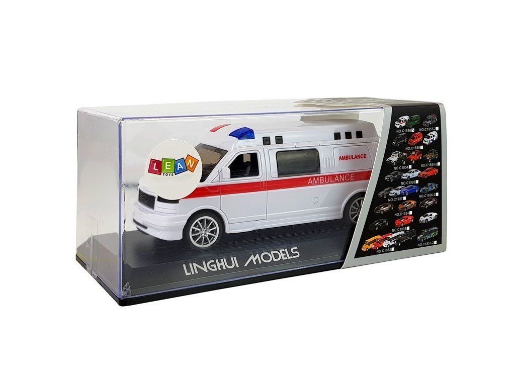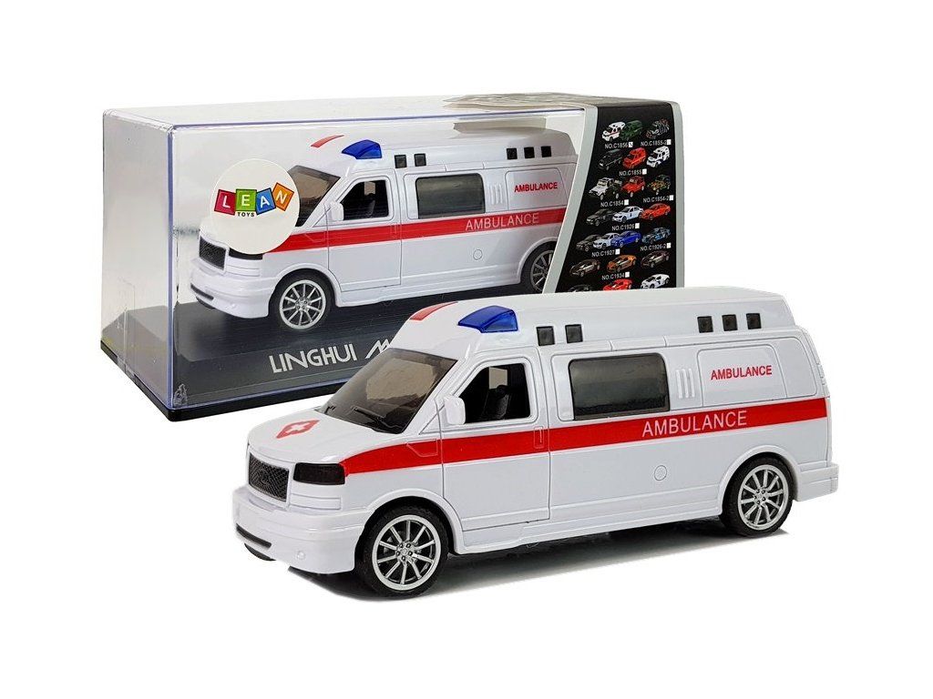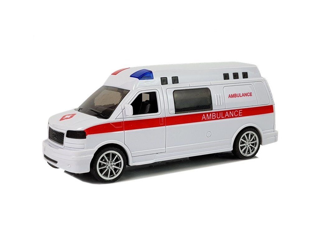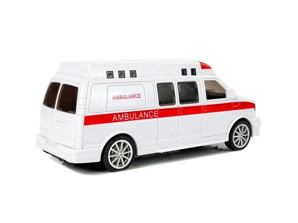 Bílá sanitka je kombinována s červenými detaily, nápisem AMBULANCE a LED diodami, které se rozsvítí při jízdě na záchrannou akci, navíc signál sirény přidá realističnosti zábavy.