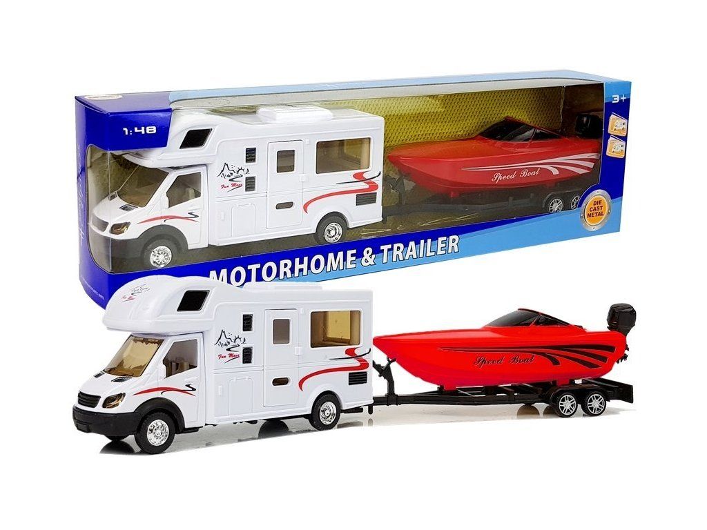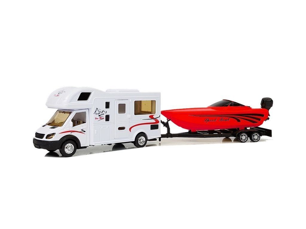 Ideální kombinace pro dovolenou u jezera nebo moře. Tato sada jistě vyvolá u vašeho dítěte vzpomínky na letní prázdniny. Karavan má natahovací pohon - stačí jej natáhnout a vyrazí. Člun si můžete vzít kamkoliv s sebou a připevnit ho za karavan.