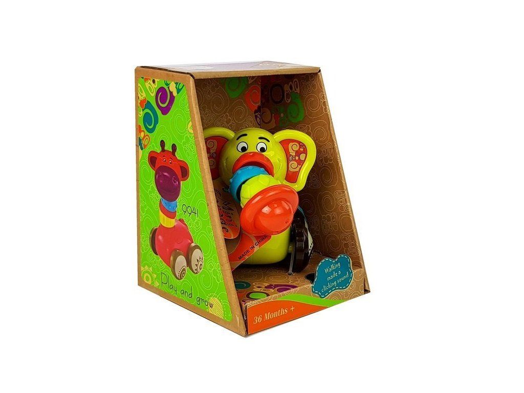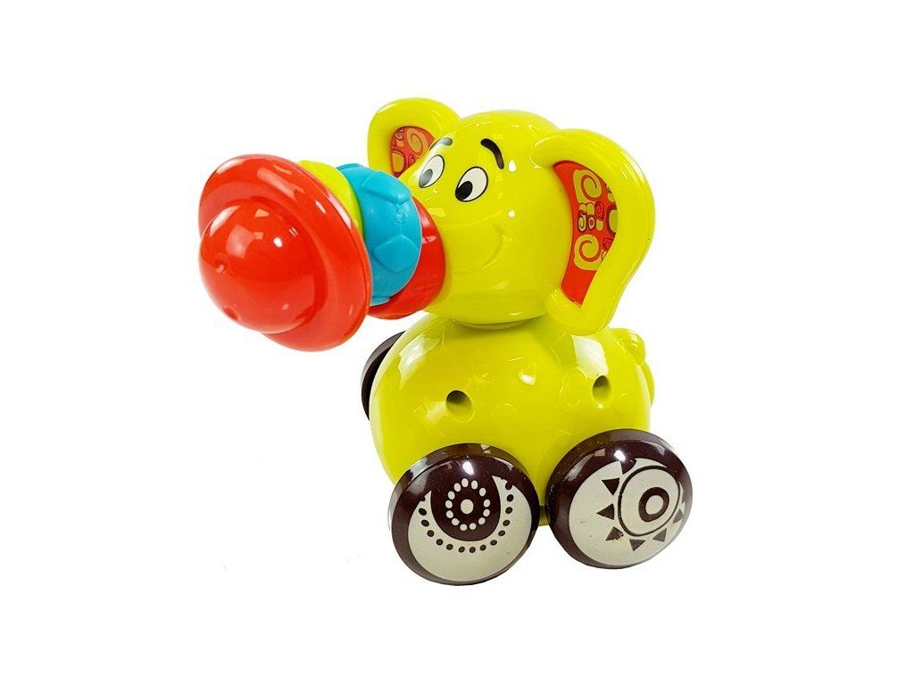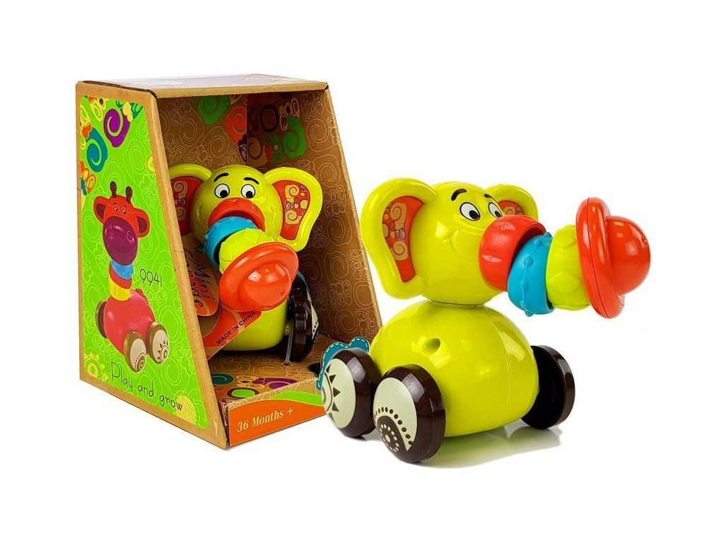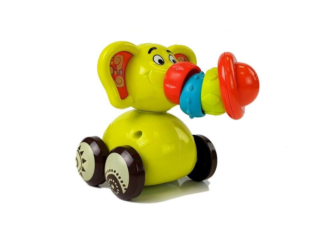 Slon má 4 kola jako autíčko, lze s ním pohybovat po podlaze nebo nábytku a v pozadí uslyší chrastění.