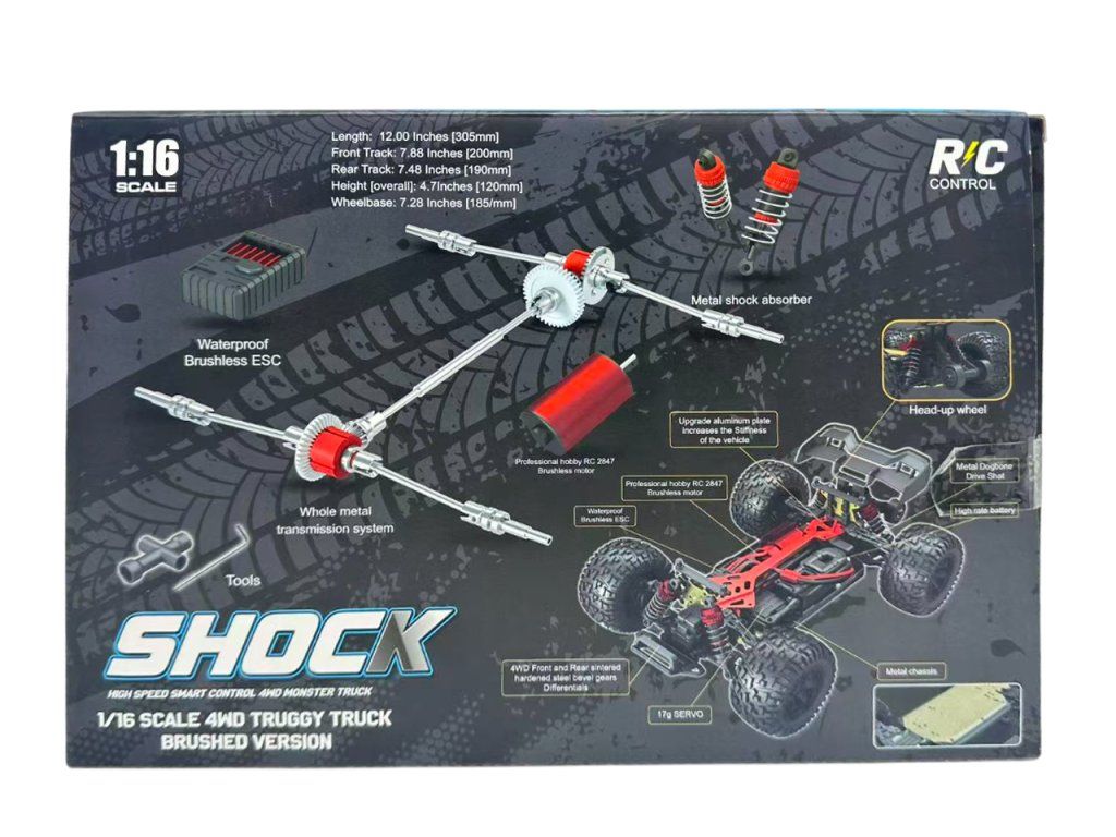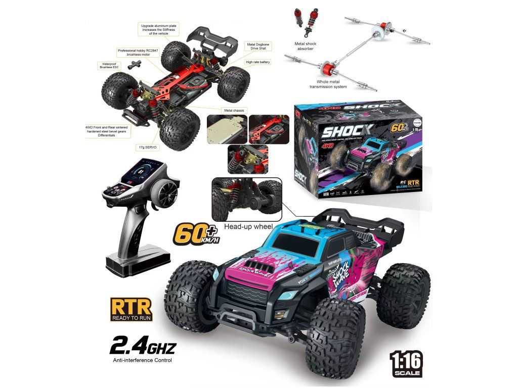 Zažijte extrémní výkon s RC monster truckem v měřítku 1:16. Tento model je osazen výkonným bezkartáčovým motorem, který dokáže dosáhnout rychlosti přes 60 km/h, a pohonem všech čtyř kol pro maximální přilnavost a stabilitu.