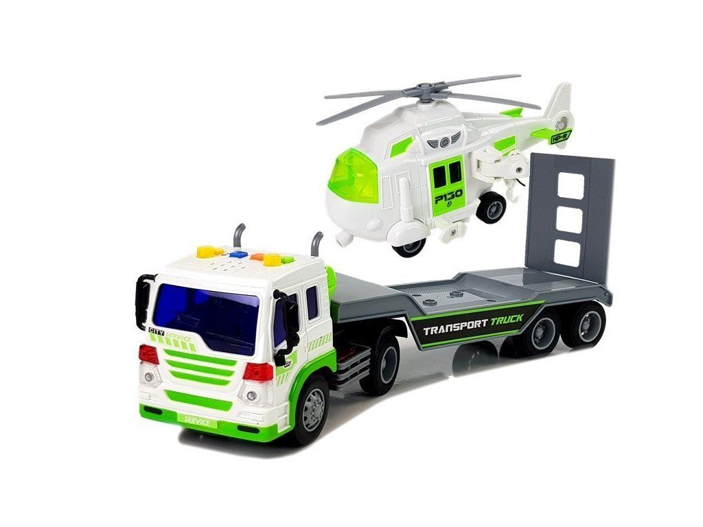 Náklaďák je bílý s dlouhým šedým přívěsem, na kterém můžete převážet vrtulník nebo jiná vozidla. Otevírací rampa v zadní části umožní vrtulníku volně nastoupit, nebo být upevněn na přívěsu. Výhodou vozidla jsou zvukové a světelné efekty. Vyrobeno s velkou přesností a pečlivostí v měřítku 1:16.