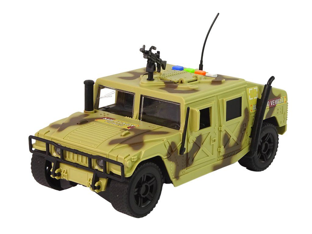 Vojenské autíčko má válečné barevné schéma, širokou karoserii a zbraň na střeše, která napodobuje skutečný model.