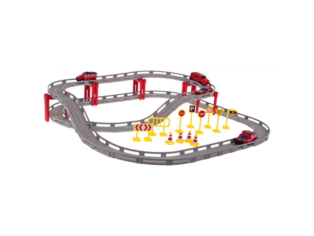 Závodní dráha v hasičské verzi pro děti od 3 let. Dráha je vyrobena z nejkvalitnějšího plastu a 3 z 4 hasičských aut, která jsou součástí balení, mají kovové karoserie. Dráha se skládá z 35 dílků tvořících dvouúrovňovou konstrukci s rovnými úseky a zatáčkami. Součástí sady jsou čtyři hasičská auta.
