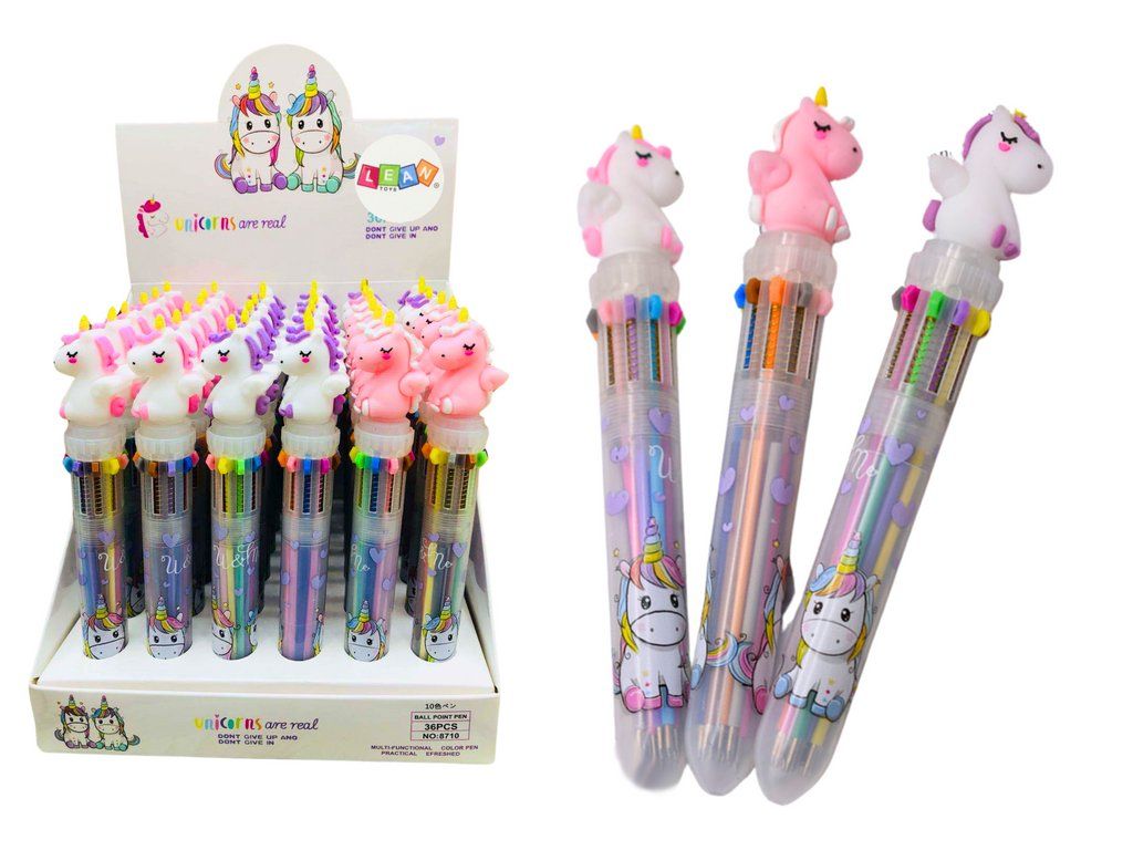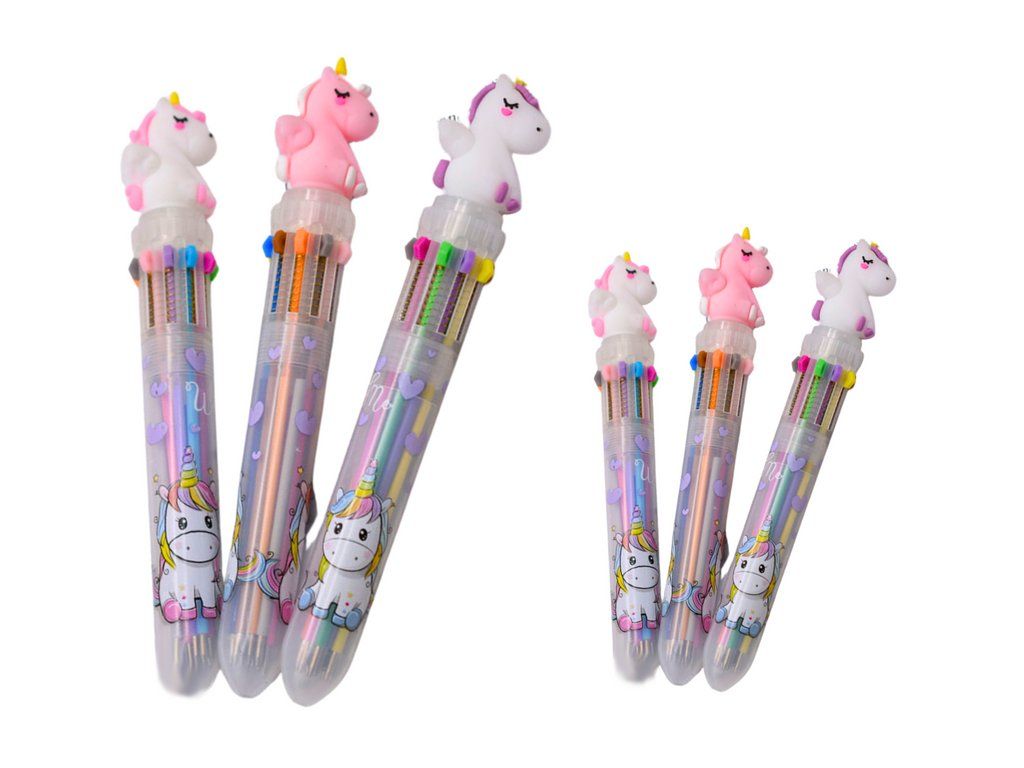 Toto funkční pero spojuje zábavu a praktičnost tím, že nabízí až 10 barev v jednom psacím nástroji. S ozdobným motivem roztomilého jednorožce určitě zaujme děti a učiní každodenní psaní více vzrušujícím. Je vybaveno několika barvami inkoustu, což umožňuje snadné změny barev bez potřeby měnit pero. Každá barva je ideální pro různé použití, od kreslení po psaní.