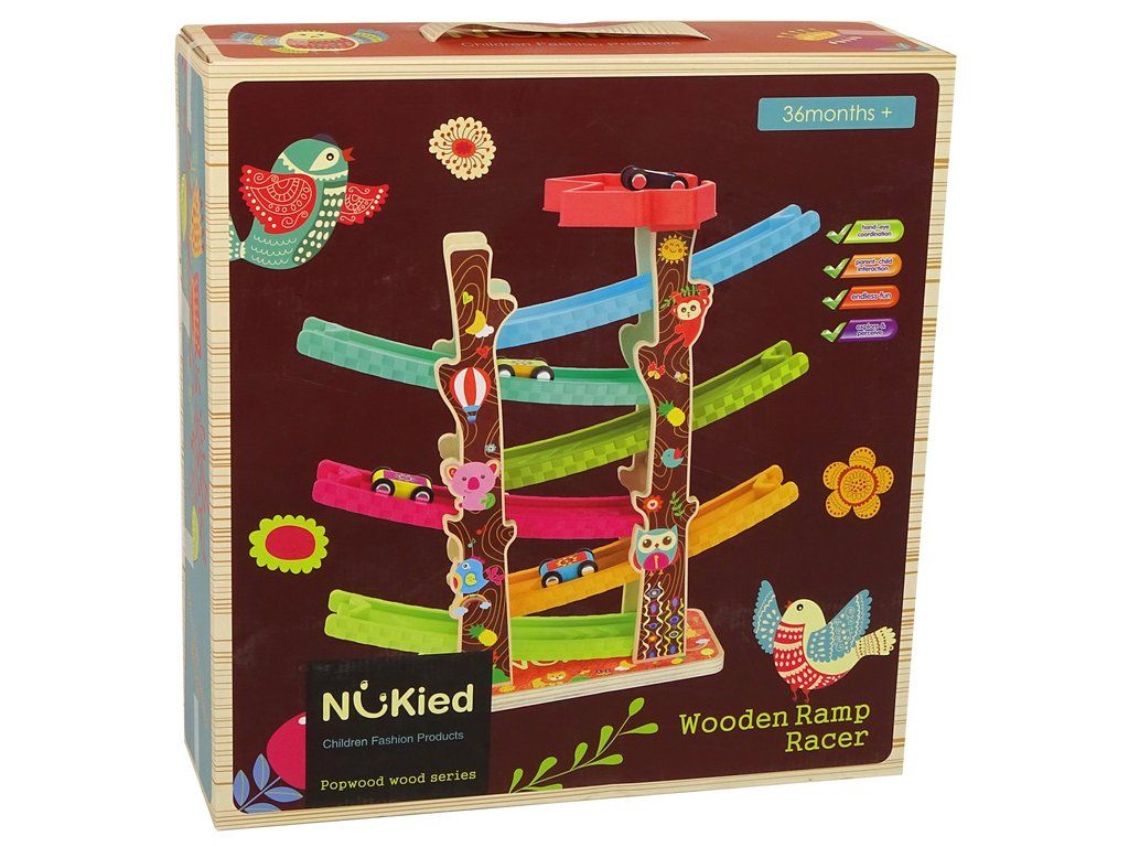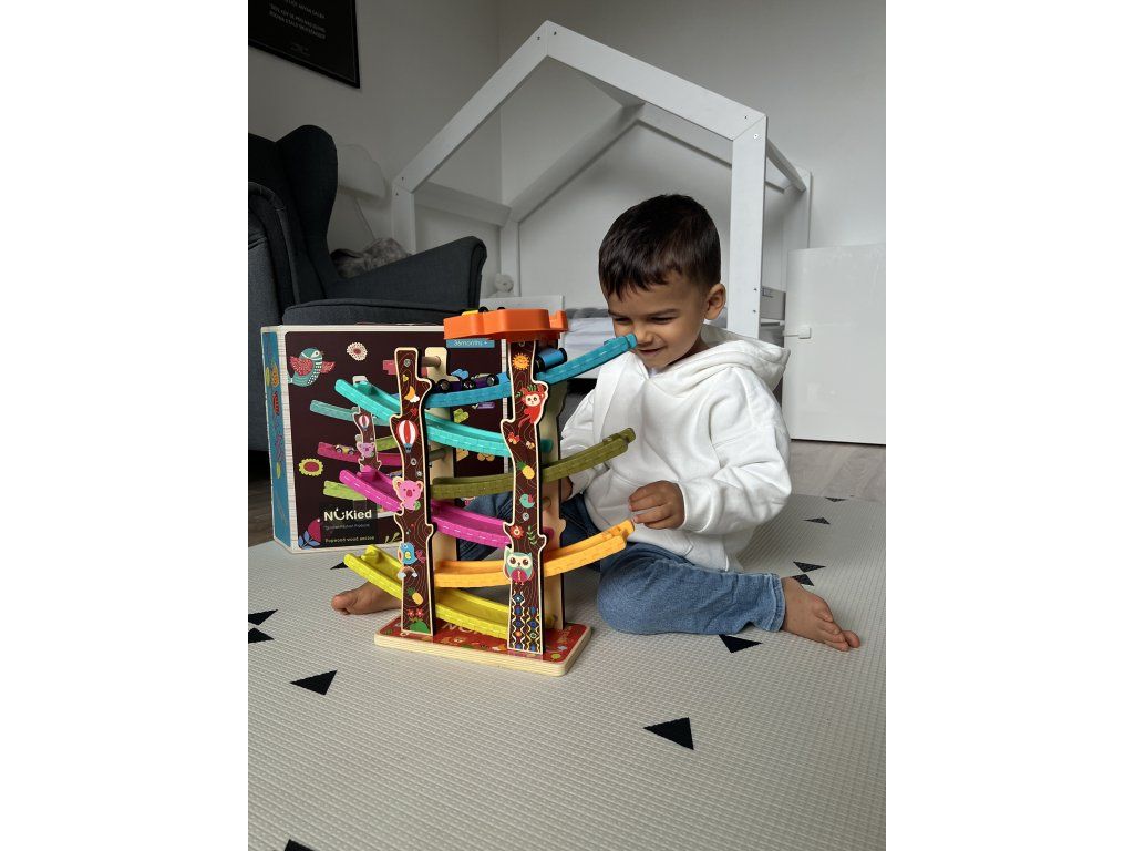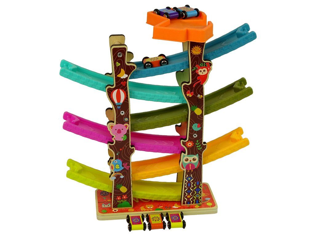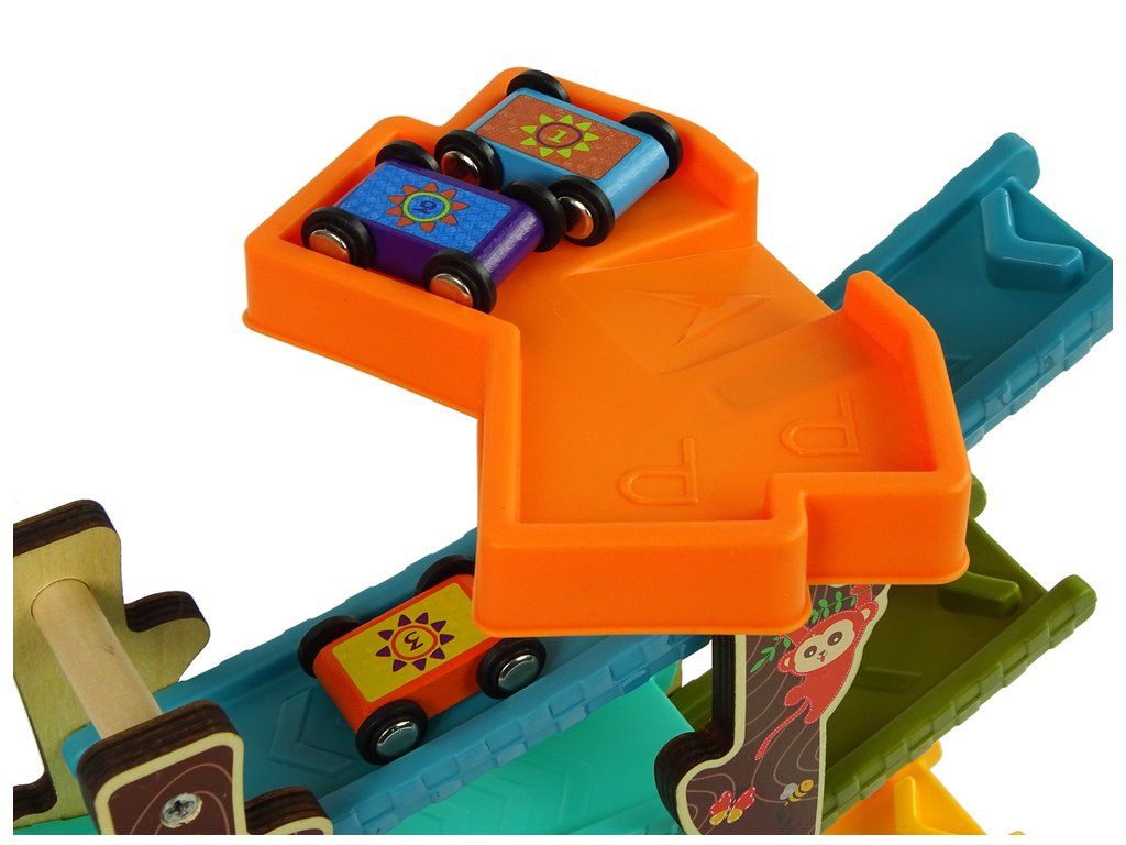 Dřevěná autodráha má 6 pater, stačí položit auto na vršek skluzavky a sledovat, jak jede až dolů. Každé autíčko je označeno čísly.