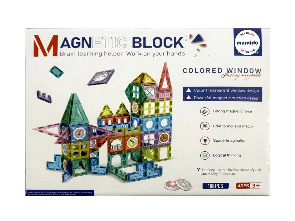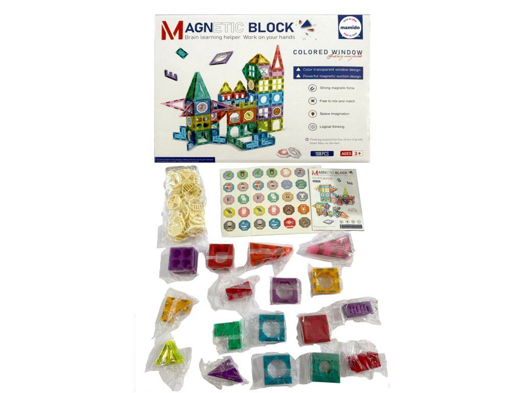 Stavebnice obsahuje 108 magnetických dílků různých tvarů – trojúhelníky, čtverce, oblouky, dlouhé panely, dekorativní okénka i speciální díly. Transparentní provedení v zářivých barvách podporuje vizuální vnímání a díky jednoduchému spojování si s ní poradí i menší děti. Ideální pro rozvoj kreativity, logického myšlení a prostorové představivosti.