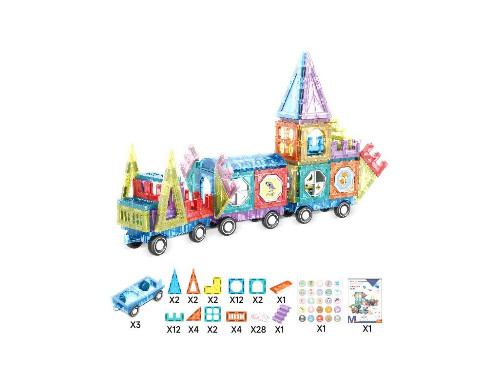 Kreativní magnetická stavebnice umožní dětem sestavit barevné stavby, vozidla a originální konstrukce díky 75 průhledným dílkům. Součástí sady jsou také kolečka, speciální okénkové panely a různé tvary, díky kterým si mohou děti vytvořit například vlastní magnetický vláček nebo dopravní soupravu.