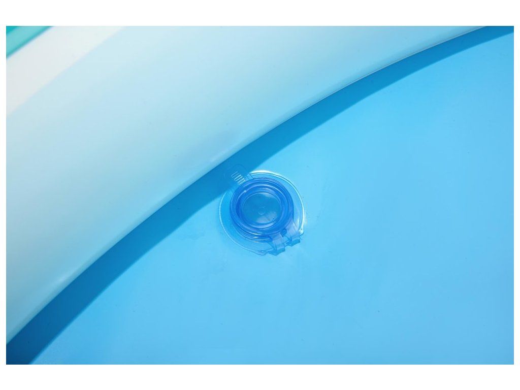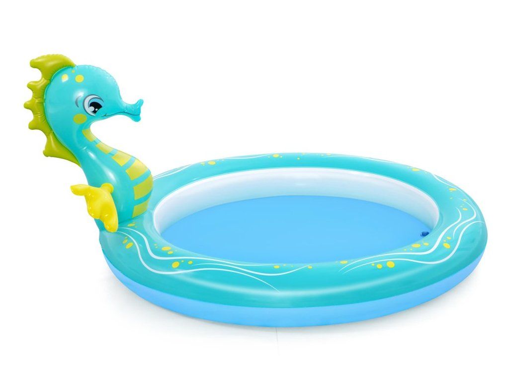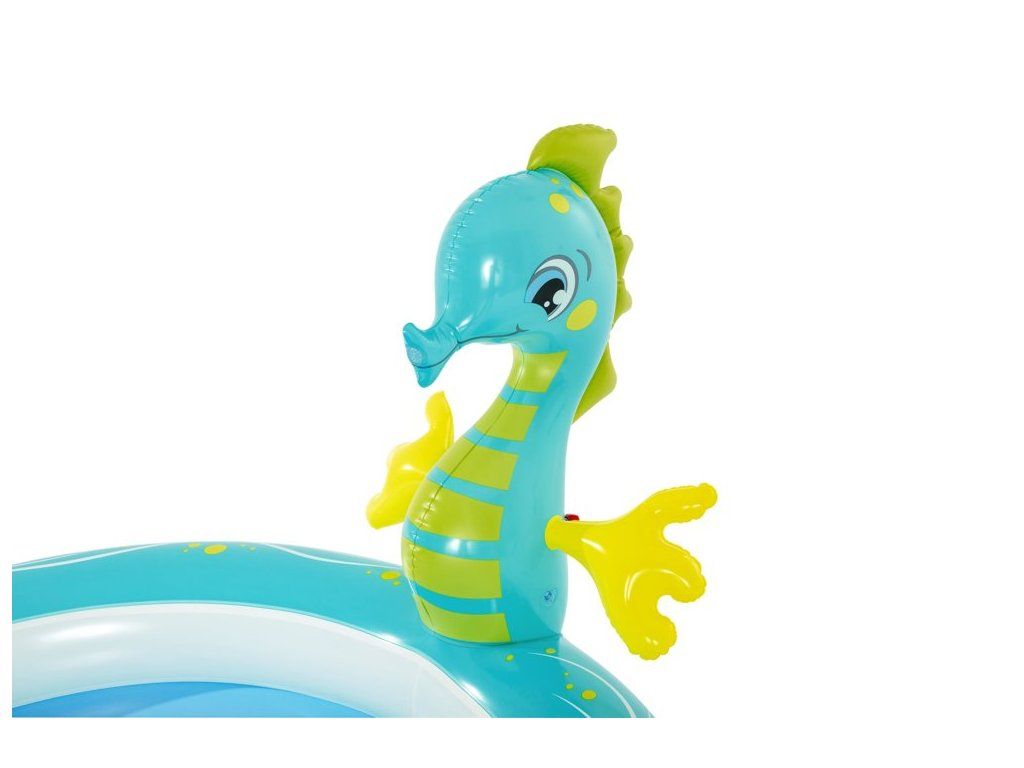 Bazén je vyroben z měkkého, ale odolného materiálu a je maximálně bezpečný pro nejmenší děti. Hlavní atrakcí je mořský koník, ze kterého po připojení zahradní hadice teče voda.