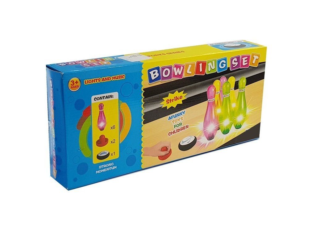 Bowlingová sada je určena pro děti starší 3 let. Hračka obsahuje 8 baterií AG13, nachází se pod diskem a každou bowlingovou kuželkou.