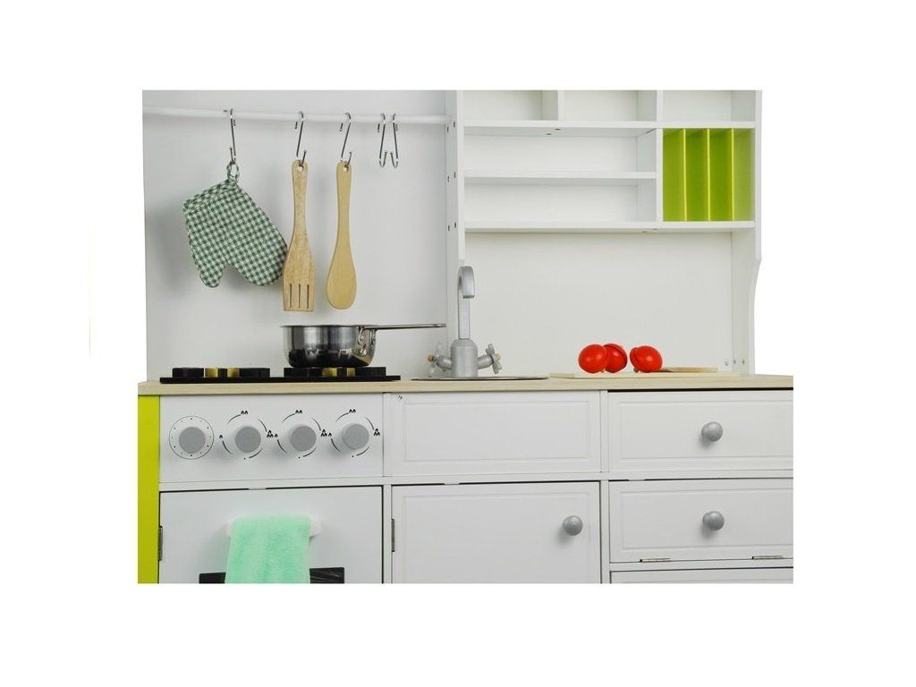 Bílo-zelená kuchyňka, která byla vyrobena z ekologického a odolného materiálu, kterým je dřevo. Jeho použití při konstrukci hračky výrazně zvyšuje nejen životnost a spolehlivost hračky, ale také pohodlí a bezpečnost při používání po dobu několika let. Začlenění této hračky do každodenní hry dítěte, pozitivně ovlivní rozvoj jeho představivosti, nezávislosti a schopnosti bezpečně si hrát s kuchyňským náčiním. Dítě poznává a učí se základní domácí práce. Hračka určená pro děti od 3 let.