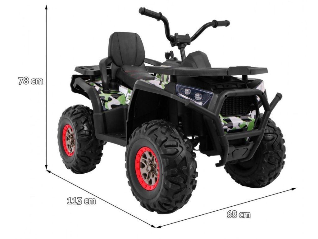 Dětská elektrická čtyřkolka je vybavena čtyřmi elektrickými motory a širokými koly z Eva materiálu. Čtyřkolka hravě zvládne různé typy terénu, nezpevněný povrch i kopce.