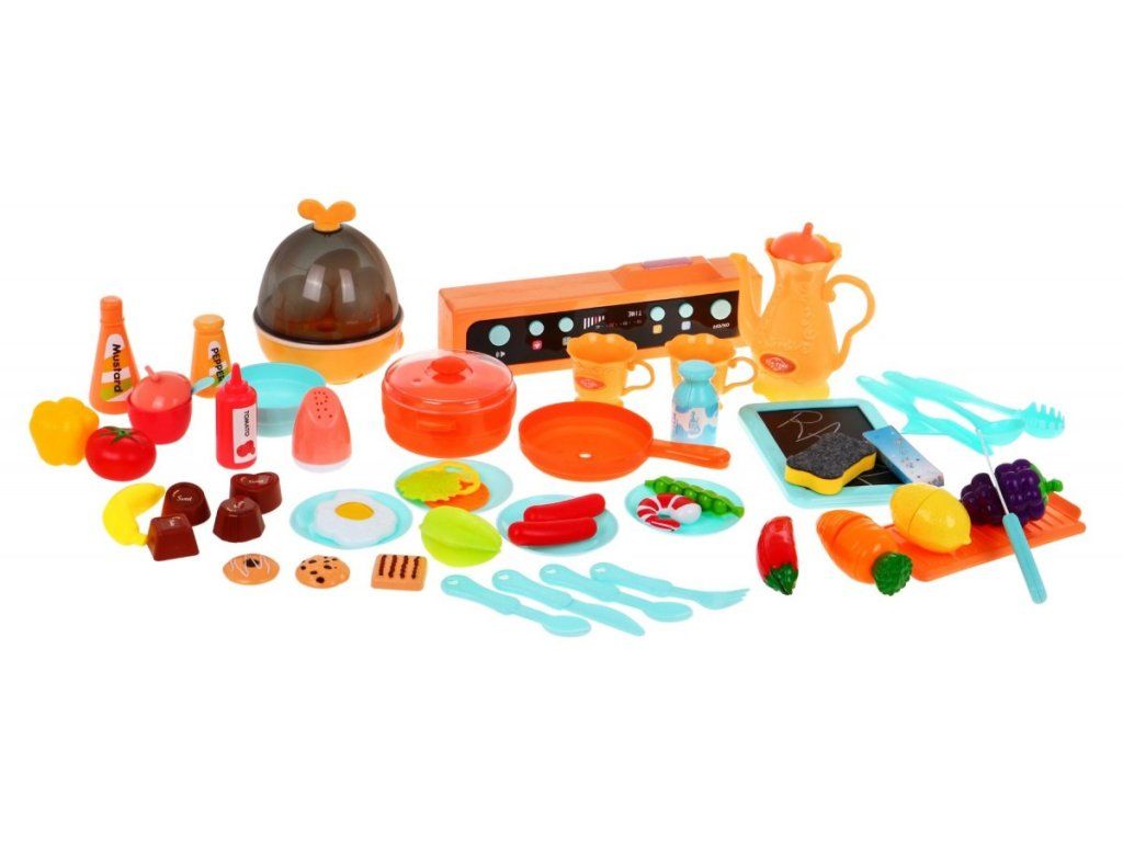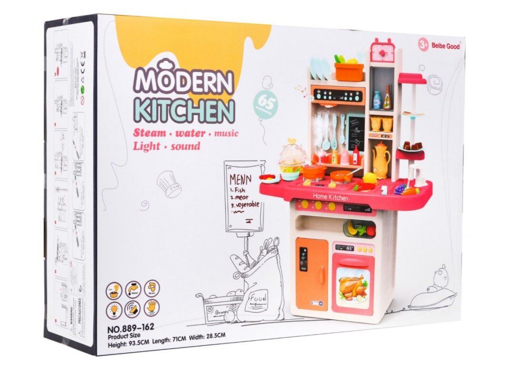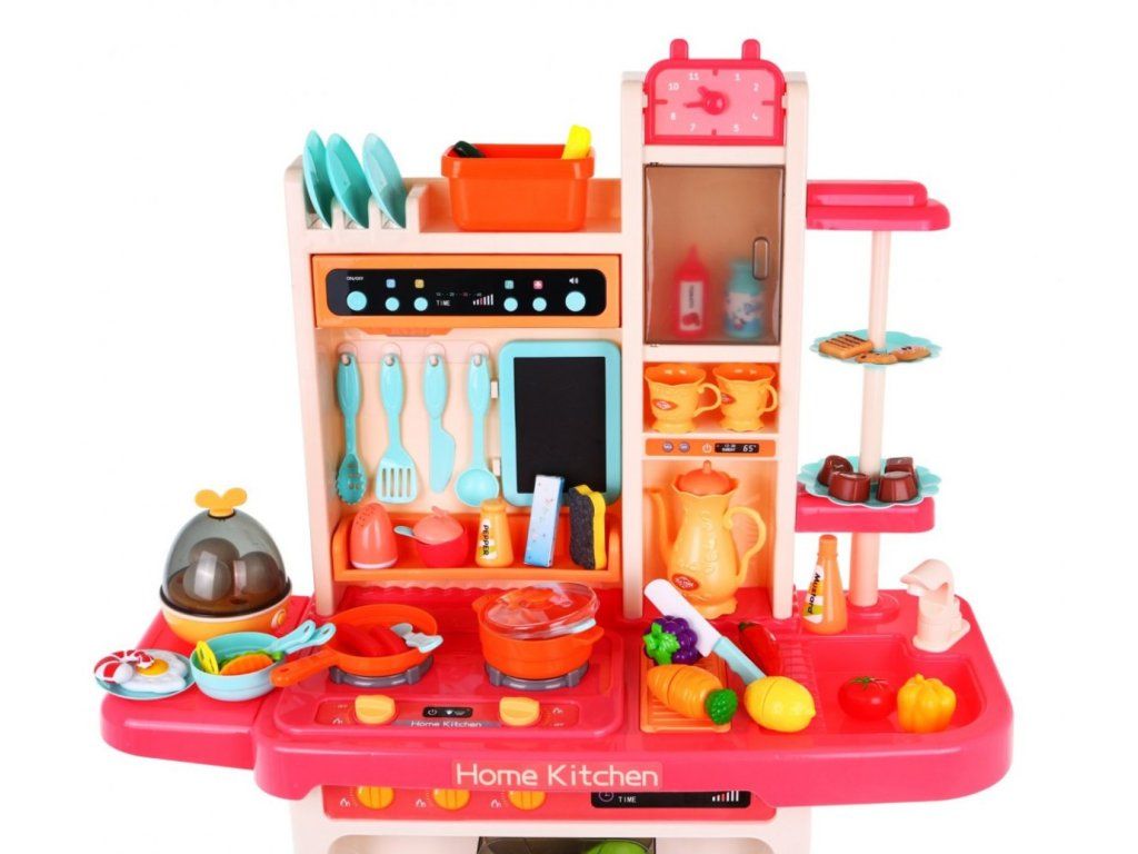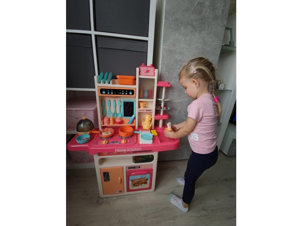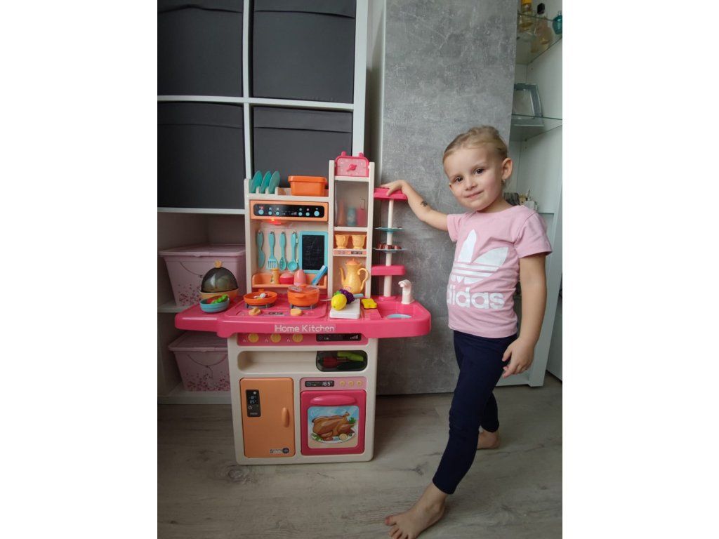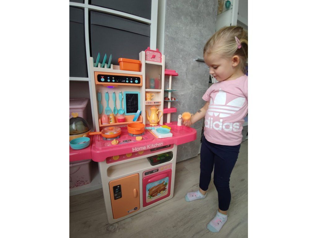 Multifunkční dětská kuchyňka s vybavením. Kuchyňka má dřez ,ke kterému lze připojit tekoucí voda, osvětlené hořáky se zvuky vaření a smažení a otočné knoflíky. Dětská kuchyňka má hudební panel a otevírací troubu a obsahuje spoustu doplňků, potravin a nádobí.