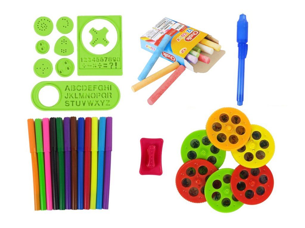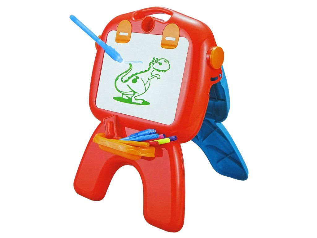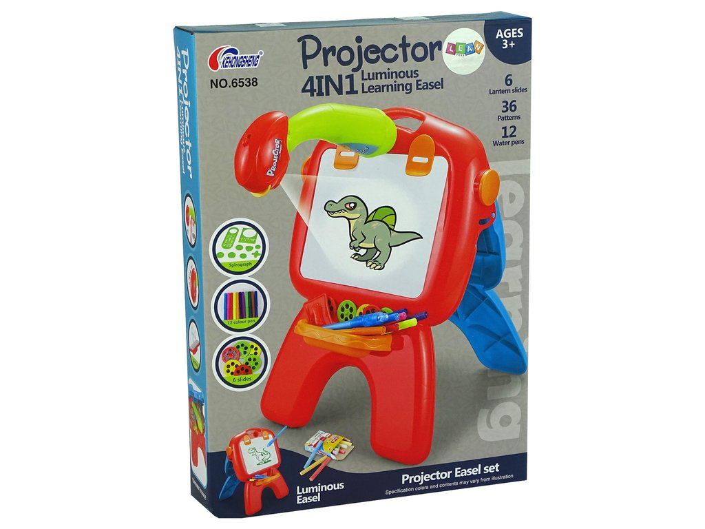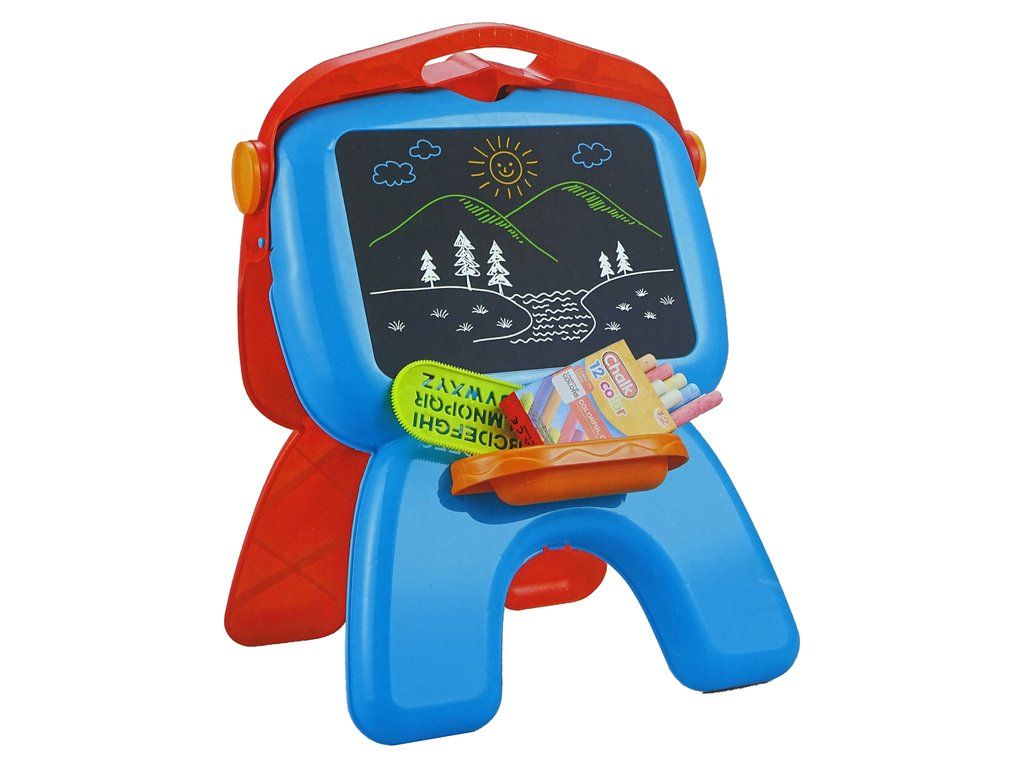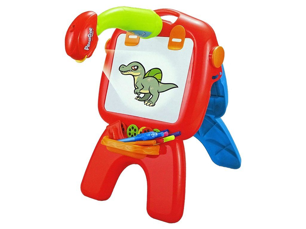 Oboustranná tabule s osvícením se dá složit na dvě strany. Má dvě kreslicí plochy. Bílá, pro použití s mazatelnými fixy a černá, pro kresbu křídou. Může být umístěna kdekoli v místnosti. Kromě toho má místo, do kterého můžete vložit fixy a další pomůcky pro kreslení. Projektor v horní části zobrazuje různé obrázky se zvířaty a postavami, které lze překreslit na povrch tabule. Šablony v sadě naučí vaše dítě správné názvy geometrických obrazců a psaní písmen.