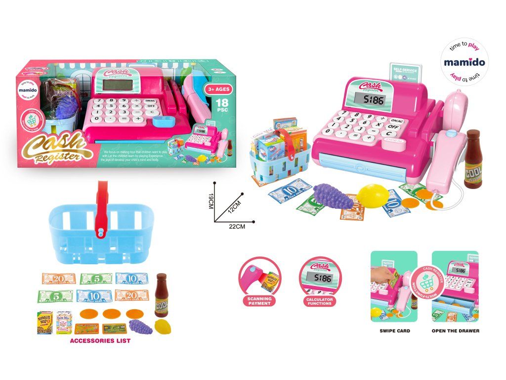 Zažijte spoustu zábavy s touto dětskou pokladnou, která děti přenese přímo do světa nakupování a prodávání. Barevná pokladna nabízí realistické funkce – tlačítkovou klávesnici, otevírací šuplík na peníze, čtečku karet, skener i funkci kalkulačky. Součástí je také nákupní košík, papírové peníze, potraviny a platební karta, takže hra může být opravdu jako v obchodě.