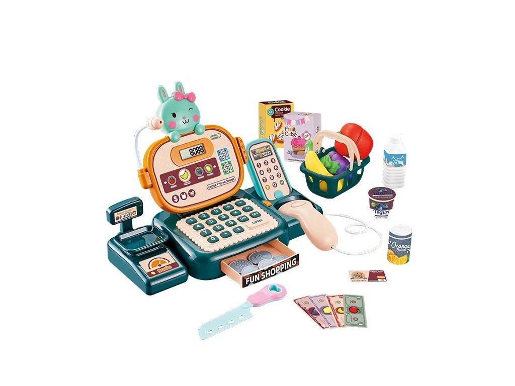 - Bohaté příslušenství: Sada obsahuje 22 různých dílů, včetně skeneru, kreditní karty, peněz, potravin a dalších doplňků pro kompletní zážitek z obchodu.
