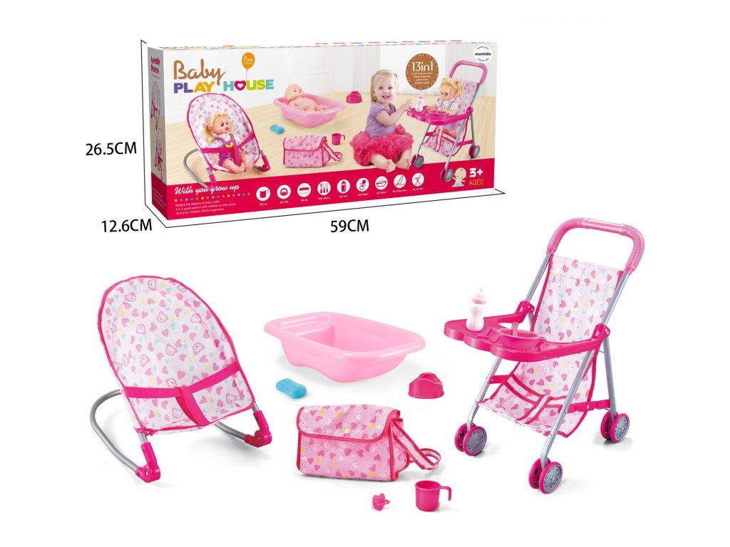 Dětská sada pro panenku 13v1 - kočárek, vanička, jídelní pultík, nosítko a doplňky pro péči o panenku