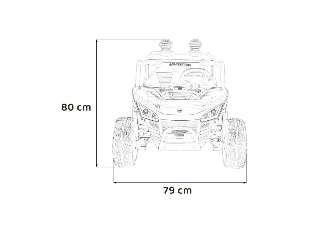 Dětské terénní auto Buggy SPEEDY 4x4 s pohonem na všechna kola je ideální volbou pro malé dobrodruhy. Čtyři výkonné motory o celkovém výkonu 800W, měkká pěnová kola EVA a zadní tlumiče zajistí plynulou jízdu i v náročnějším terénu. Auto je vybaveno bezpečnostními pásy, LED světly a praktickým dálkovým ovladačem s funkcí STOP.