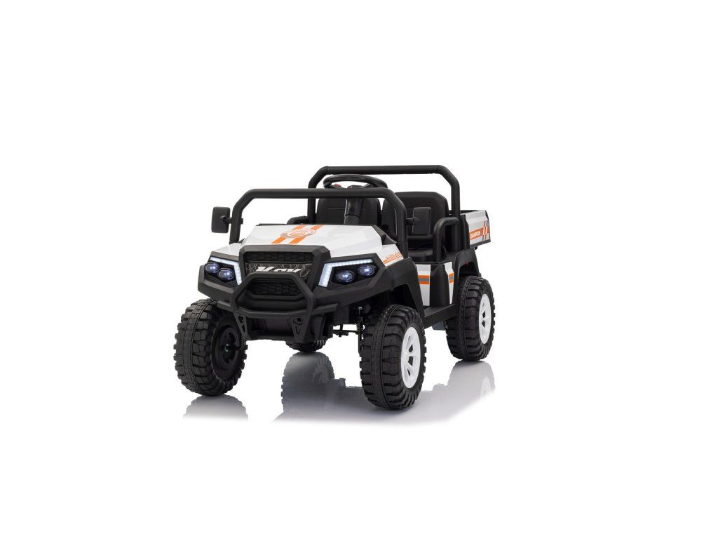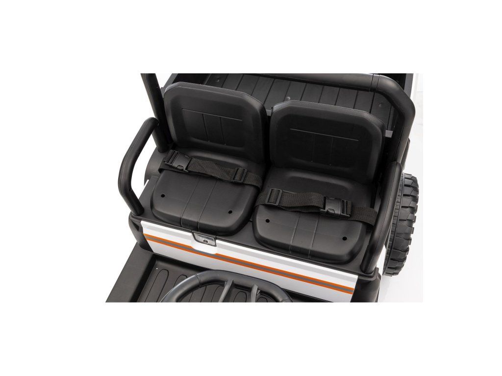 Auto má pohodlná dvě sedadla potažená eko kůží, vybavená bezpečnostními pásy. Kromě realistického zvuku motoru a LED světel (přední i zadní) potěší i multimediální panel s Bluetooth, FM rádiem, MP3 a vstupem na USB. Na volantu najdeme také klakson a ovládací tlačítka pro zvuky.