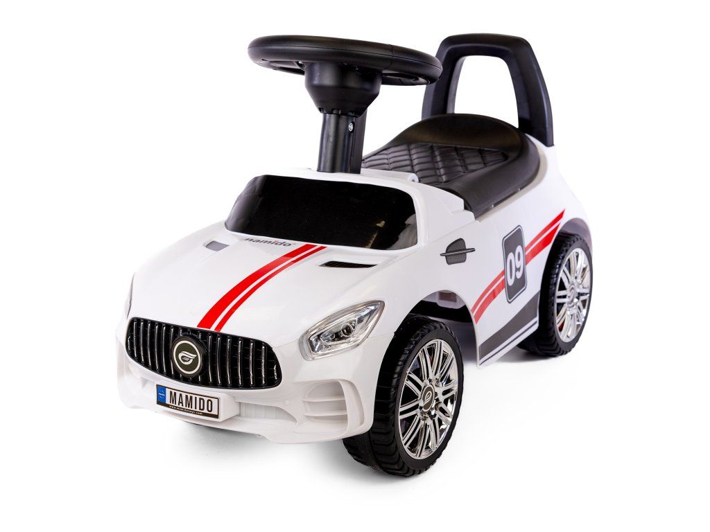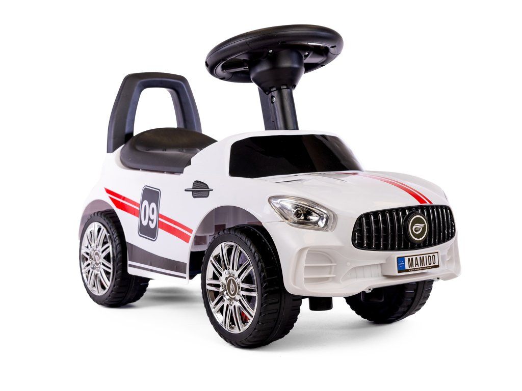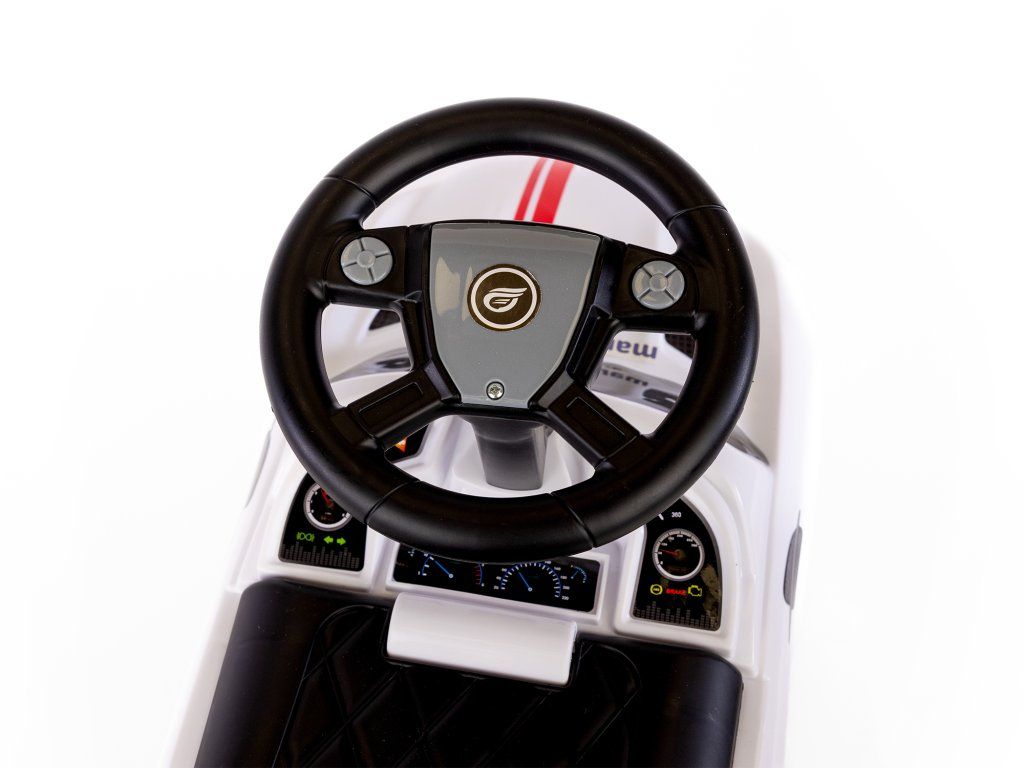 Bílé odrážedlo je z velmi lehké konstrukce, což usnadňuje řídit. Ve velké sedačce je úložný prostor pro malé předměty dítěte, například hračky, které si chce vzít s sebou na procházku. Pohodlné opěradlo připevněné k sedadlu zajistí, že si batole při hraní udržuje rovné držení těla a také se cítí pohodlně. Velká, široká kola vám umožní zvolit různé povrchy, díky nimž bude auto jezdit doma i na zahradě. Nosnost je 30 kg, a proto bude určitě sloužit vašemu dítěti po dlouhou dobu.