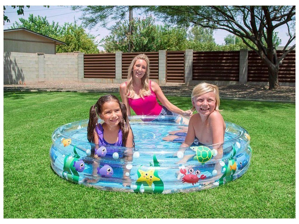 Barevný nafukovací bazén Bestway o průměru 152 cm s mořskou grafikou. Bazén se skládá ze 3 nafukovacích kruhů, které zajišťují stabilitu. Bazén je vyroben z odolného vinylu o tloušťce 0,19 mm a je ideální pro horké letní dny.