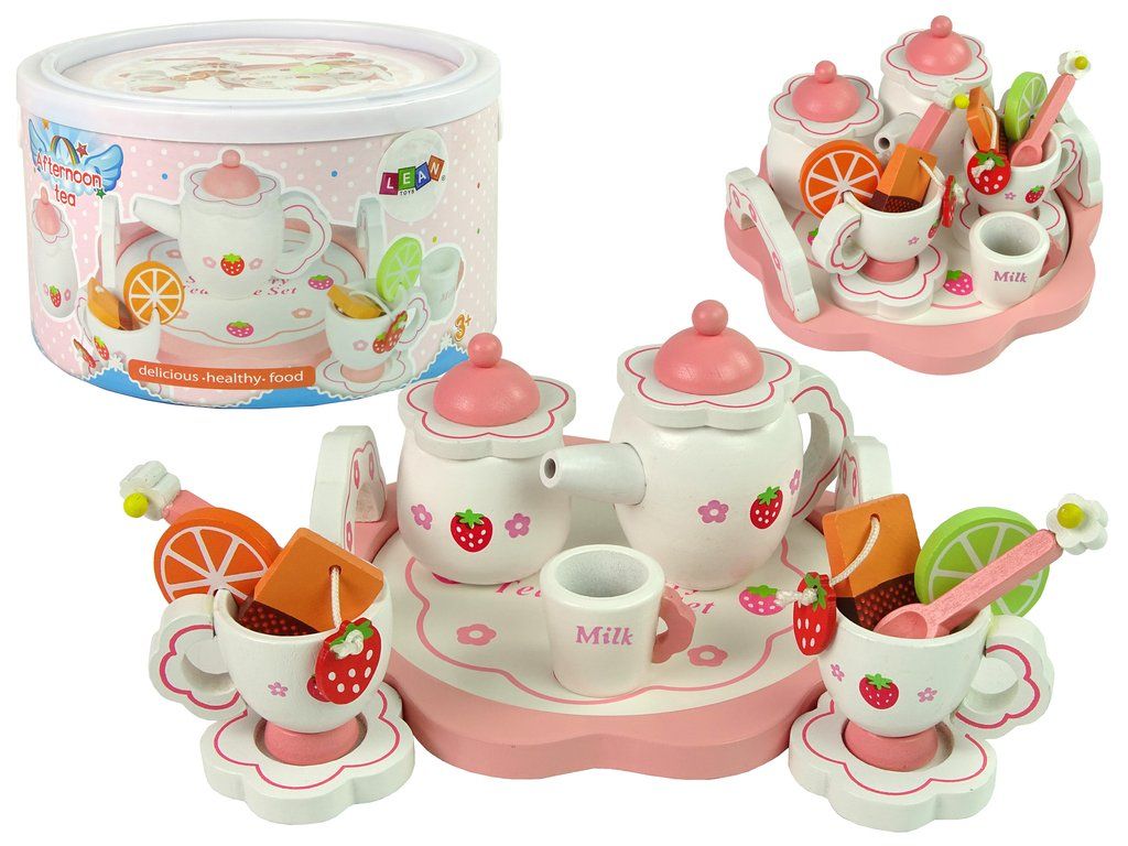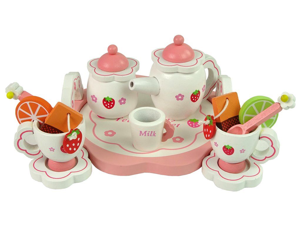 Čajový set nesmí chybět na žádném odpoledním dýchánku. Čajový servis je vyrobený v bílo-růžovém barevném provedení s motivem květin a jahod. Největší výhodou je, že sada je vyrobena ze dřeva, což zvyšuje bezpečnost a komfort používání, a také životnost hračky. Hračka u dětí rozvíjí kreativitu, motoriku a logiku a zároveň přináší spoustu zábavy.