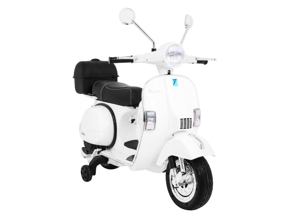 Kdo by neznal skútr značky Vespa? Tento legendární skútr může řídit i Vaše dítě, a to díky tomuto licencovanému modelu. Skútr má kvalitní sedadlo potažené měkkou ekologickou kůží a měkká kola EVA. K tomu všemu krásné přední a zadní LED světla a dokáže přehrávat MP3 soubory, takže si dítě může za jízdy poslechnout svou oblíbenou písničku a zároveň zdokonalovat své řidičské schopnosti.