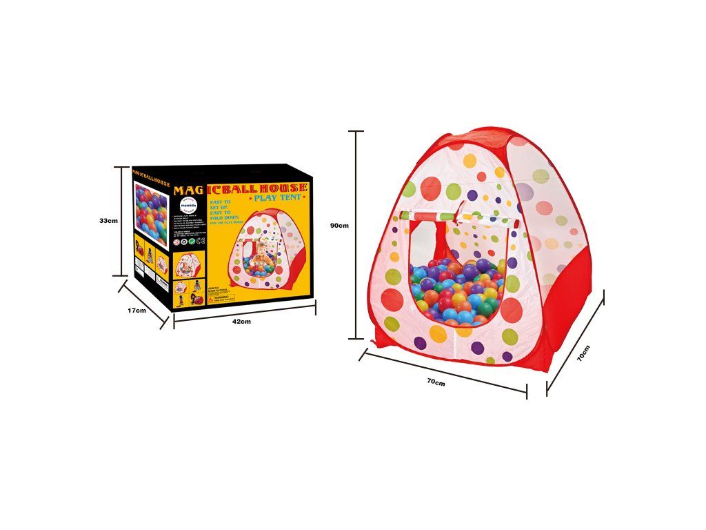 Veselý dětský stan s barevnými puntíky promění pokoj nebo zahradu v hravé útočiště. Díky průhledným stěnám mají rodiče stále přehled, zatímco děti si užívají vlastní prostor plný fantazie. Součásti balení je 50 míčků.