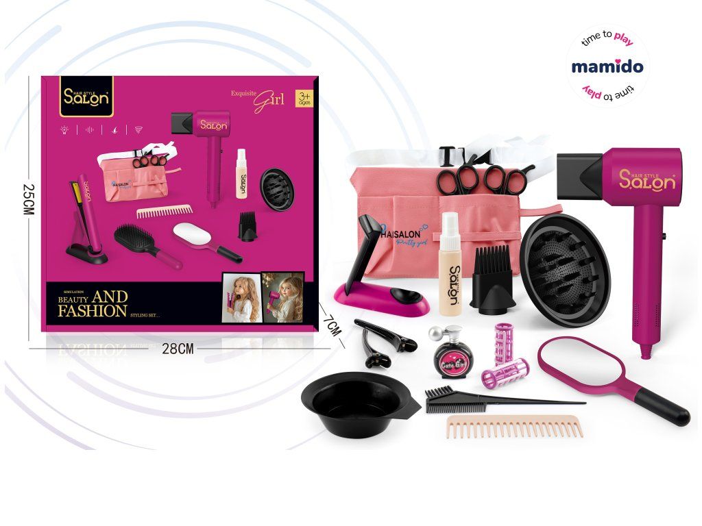 Tento růžový kadeřnický set pro děti nabízí vše, co malá stylistka potřebuje k vytvoření dokonalého účesu. Obsahuje elektrický fén, žehličku, hřebeny, nůžky a mnoho dalších doplňků, které zaručí hodiny kreativní zábavy. Hračka podporuje fantazii, jemnou motoriku i sociální hru.
