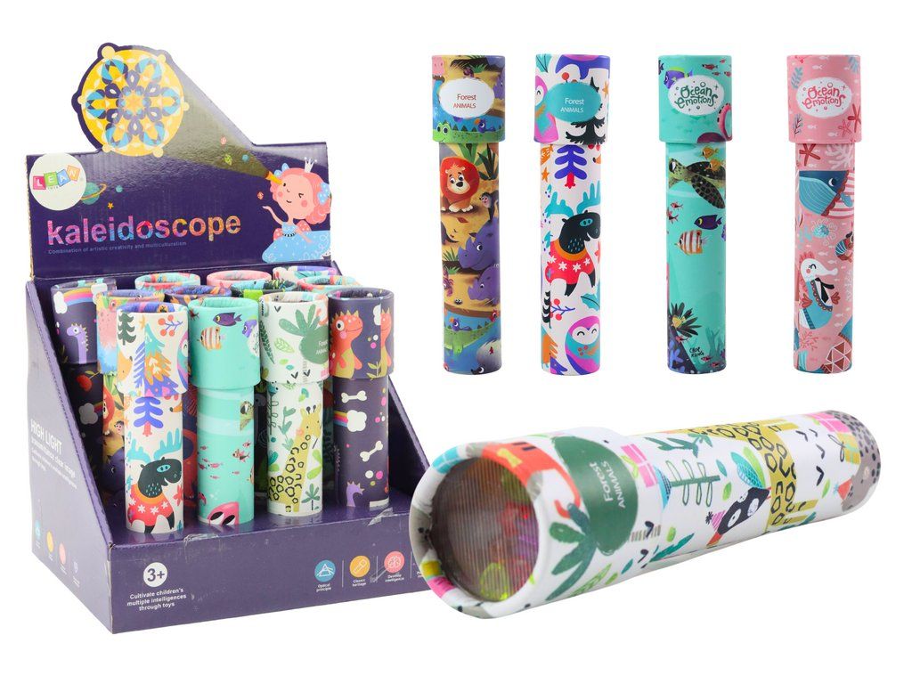 Každé otočení kaleidoskopu způsobí, že dítě vidí měnící se, různobarevné symetrické obrazce a pestré barvy. Tyto dynamické vzory poutají pozornost a okouzlují, zároveň stimulují představivost mladého objevitele. Dítě může trávit hodiny otáčením kaleidoskopu a pozorováním, jak se jeho svět mění a vyvíjí v nekonečné množství kombinací barev a tvarů.
