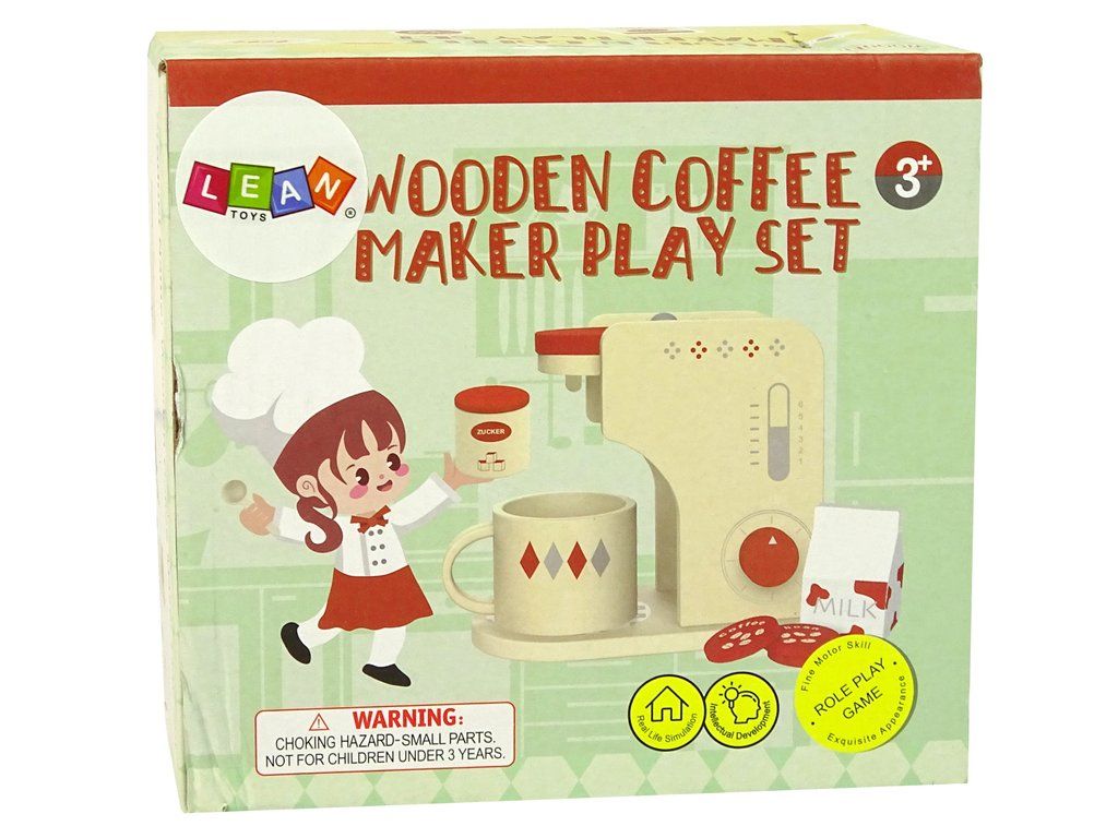 Dětský kávovar nesmí chybět v žádné dětské kuchyňce. Kávovar má pohyblivé části, které pomohou rozvíjet úchop a manuální dovednosti. Sada obsahuje šálek, cukr, mléko a 3 druhy malých kapslí, které je nutné vložit do kávovaru před vařením kávy. Poté pomocí knoflíků nastavte kávu, kterou si batole vybere. Největší výhodou hračky je ta, že sada je vyrobena ze dřeva, což zvyšuje bezpečnost, a také životnost hračky.