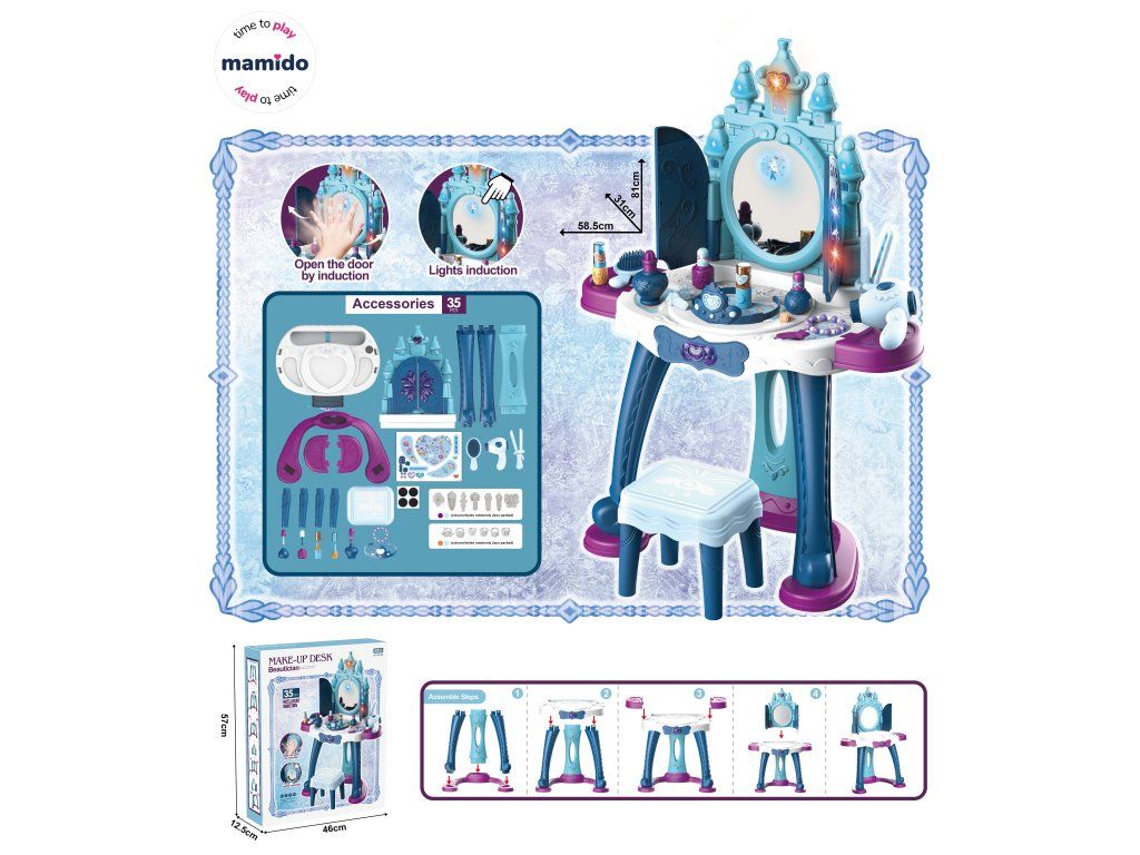 Toaletní stolek je vybaven velkým zrcadlem, které se po doteku rozzáří a otevře dvířka jako z pohádky. Bohaté příslušenství podporuje kreativní hru a rozvoj fantazie, zatímco stabilní konstrukce zajistí bezpečné používání. Součástí je i pohodlná stolička, na které může malá princezna při hraní sedět. Součástí balení je navíc 35 doplňků – hřebeny, fén, lahvičky na „parfémy“, tiára, šperky a další příslušenství, které dětem umožní napodobovat skutečné líčení a účesy.