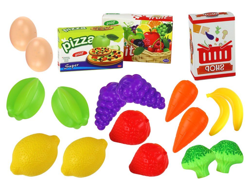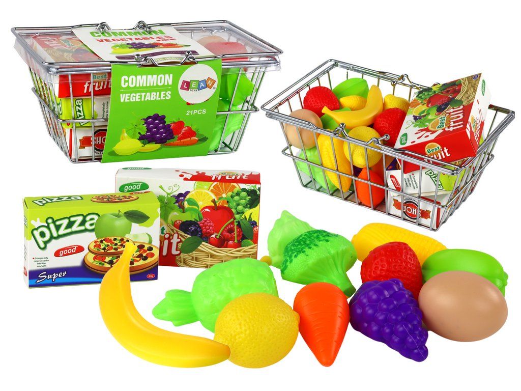 Uvnitř košíku najdete celou řadu potravin, od vajíček po zeleninu, ovoce, pizzu a ovocnou šťávu. Tyto realisticky vyrobené předměty jsou dokonalým doplňkem košíku, který hře dodává ještě větší autenticitu a umožňuje dětem simulovat nakupování a přípravu jídla.