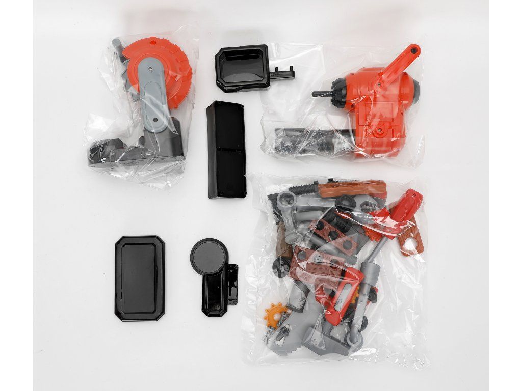 Součástí je 65 dílů, včetně pracovního stolu, elektrické vrtačky na baterie, kotoučové pily, klíčů, šroubů a dalších nástrojů. Děti si tak mohou hrát na opraváře a rozvíjet svou představivost, jemnou motoriku i technické dovednosti.