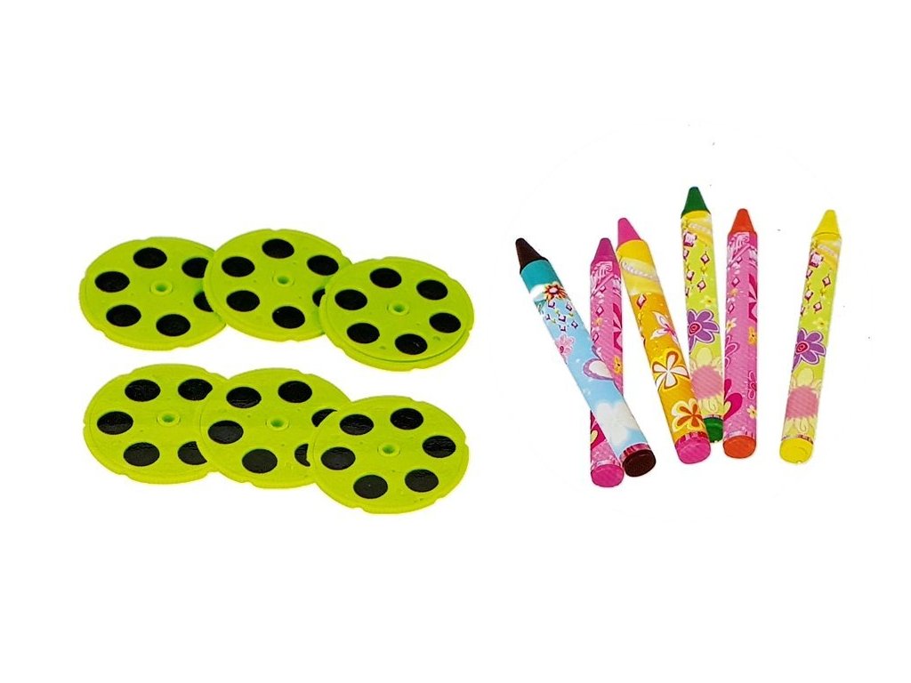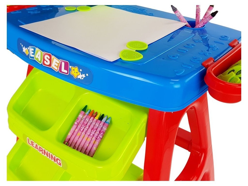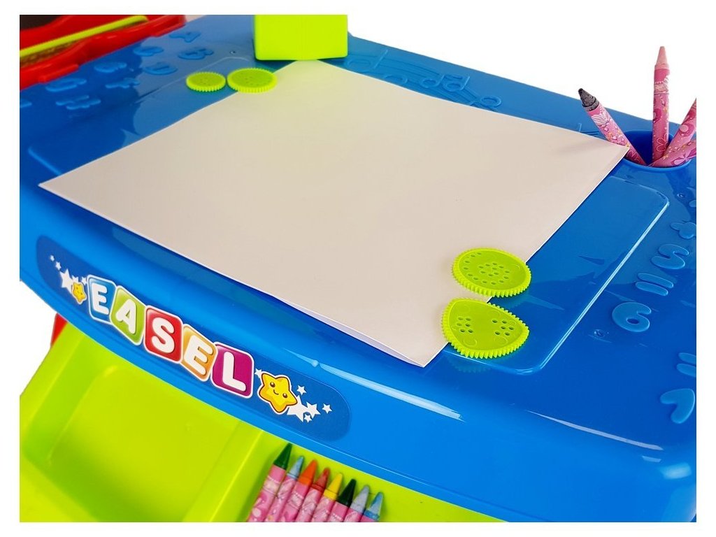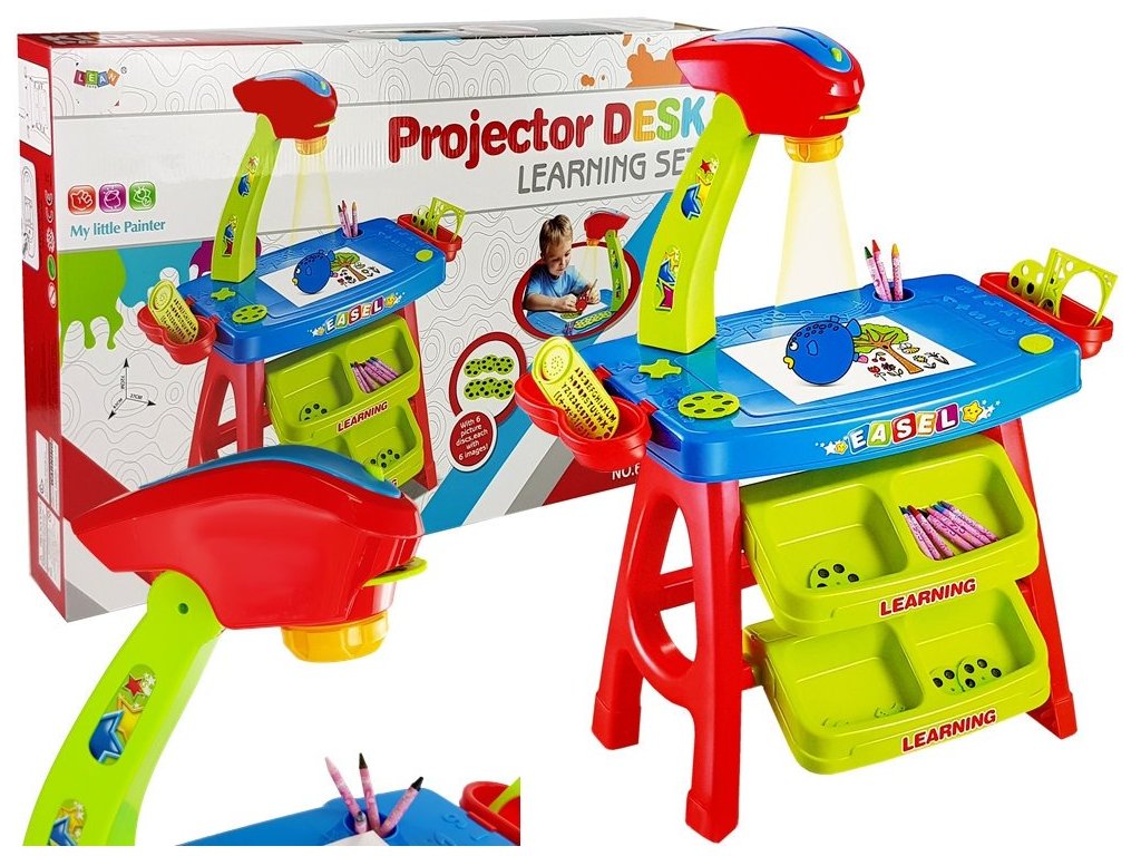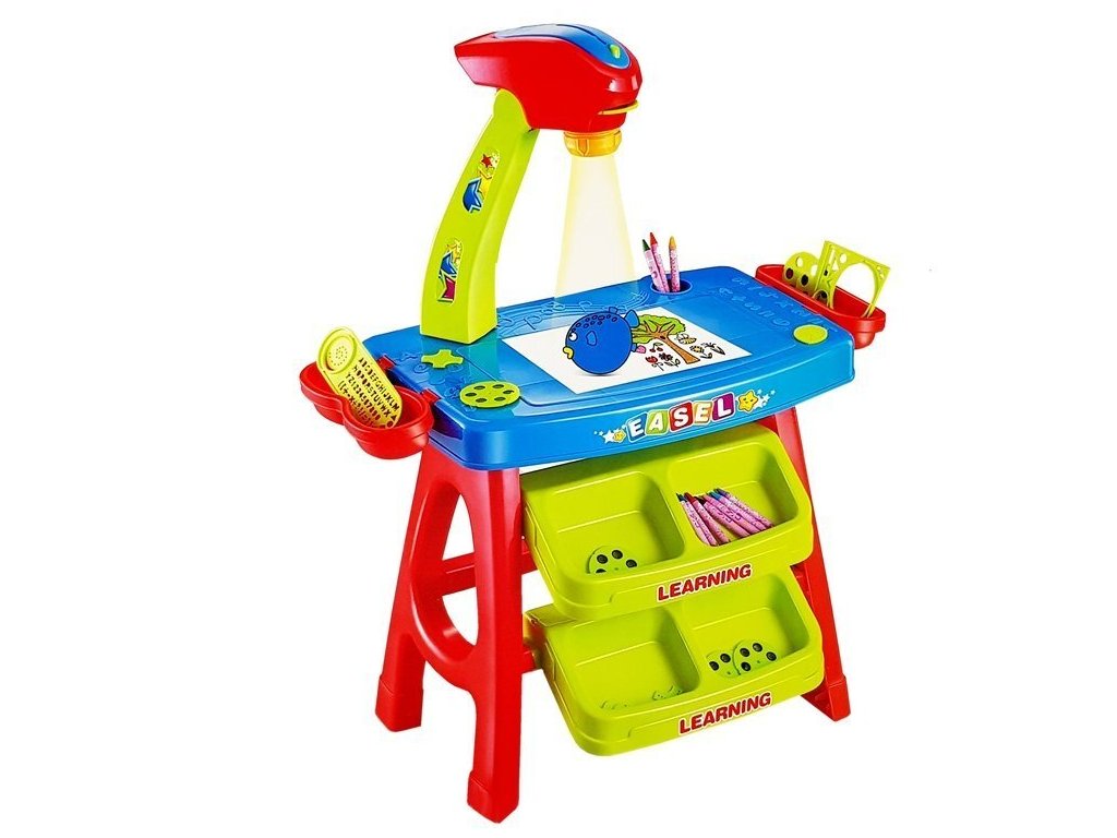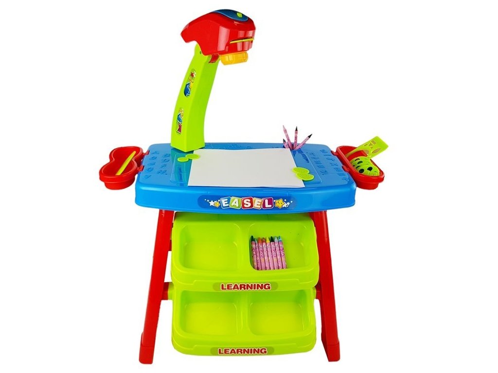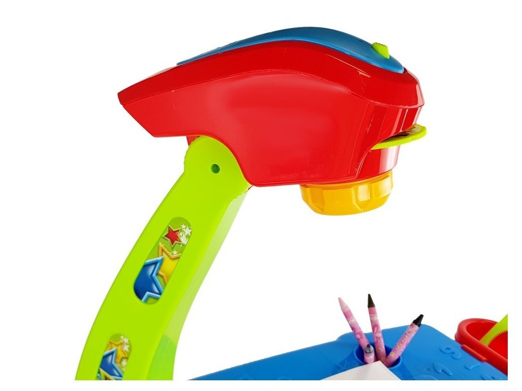 Kreslící stolek s úložným prostorem a projektorem, z kterého jde promítat 36 obrázků na šablonách. Na šablonách se nachází obrázky zeleniny, vozidel a zvířátek.