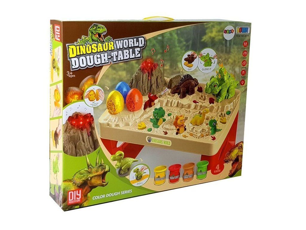 Dětský stoleček s plastelínou je skvělý dárek pro všechny milovníky dinosaurů. Hračka rozvíjí u dětí kreativitu, manuální dovednosti a pomáhá rozvoji koordinace ruka-oko. Sada umožní dětem si vyrobit s plastelíny vlastního dinosaura za pomocí formiček ve tvaru vajíčka. Na stolečku se nachází sopka, která po vložení baterií svítí a vydává zvuky.