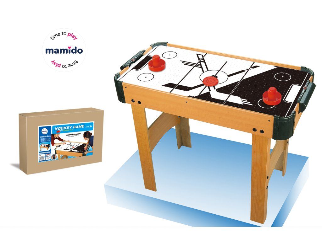 Hrací deska s moderním potiskem poskytuje ideální prostor pro dynamickou hru. Vestavěné manuální počítadlo gólů udržuje přehled o skóre a umožňuje jednoduché sledování průběhu zápasu. Stabilní dřevěné nohy zajišťují bezpečné používání a pohodlnou výšku pro děti od přibližně 3 let. Součástí jsou dvě posuvadla a puk, takže můžete hrát ihned po sestavení.
