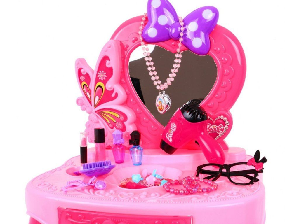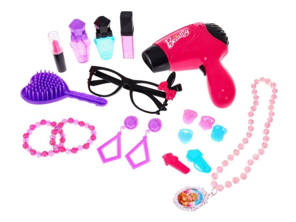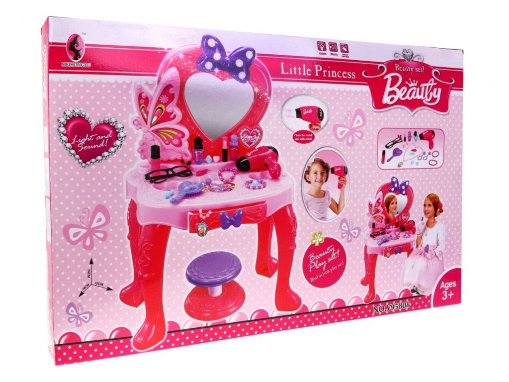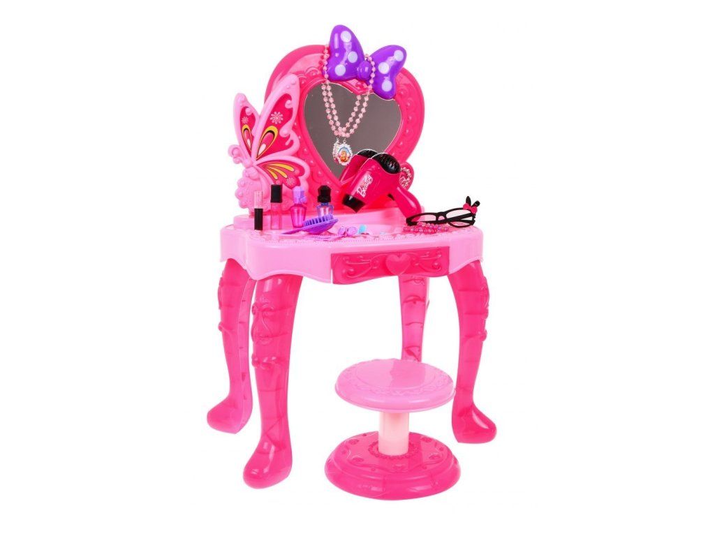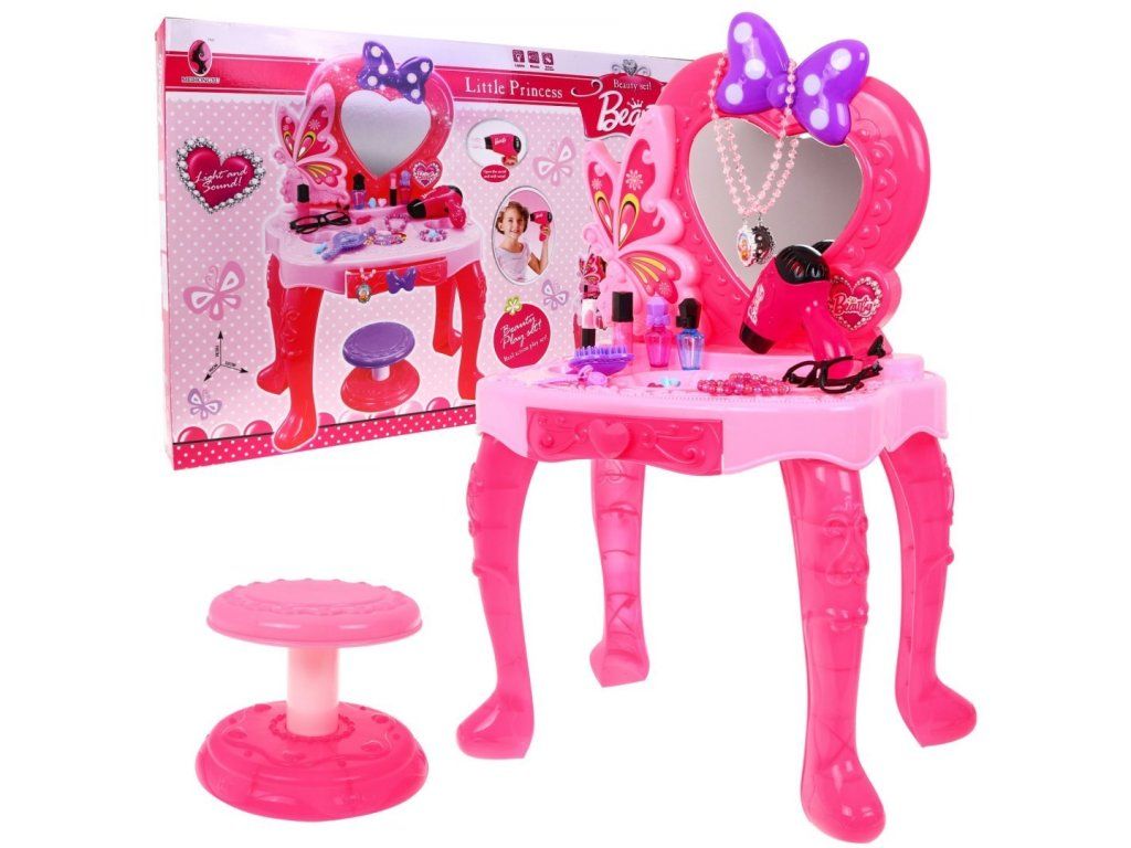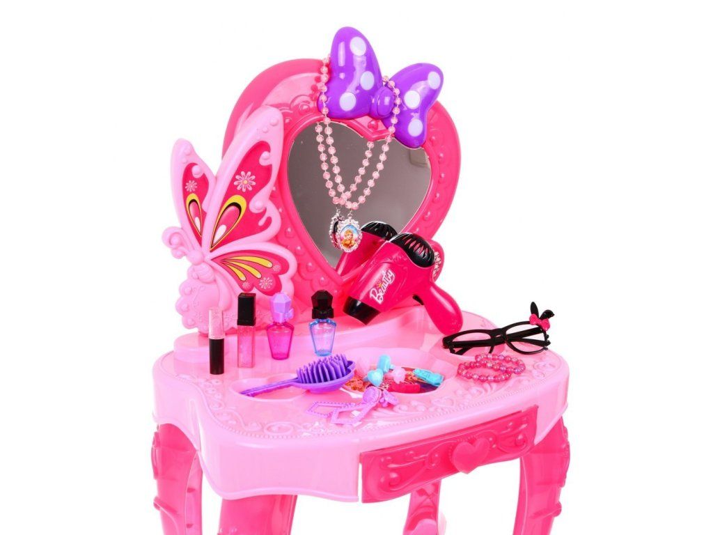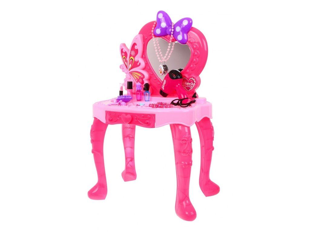 Dětský toaletní stoleček s příslušenstvím pro malou slečnu se bude vyjímat v každém dětském pokoji. Na stolečku se nachází zrcadlo, které je ozdobené mašlí, která má šest puntíků a ty svítí. Stoleček má zásuvku, do které můžete uložit doplňky, které jsou v sadě. V sadě se nachází šperky a fén, který funguje jako skutečný. Fén má funkci foukání a vydává zvukové efekty.