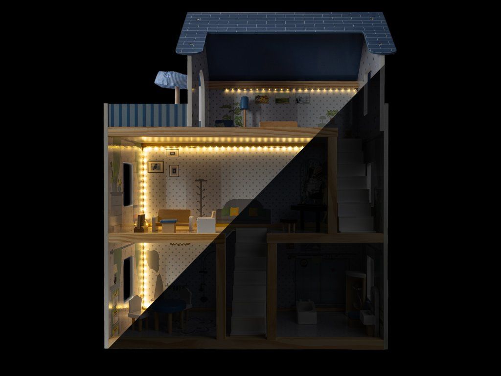 - Obsah balení: Nábytek, domeček, LED osvětlení, doplňky