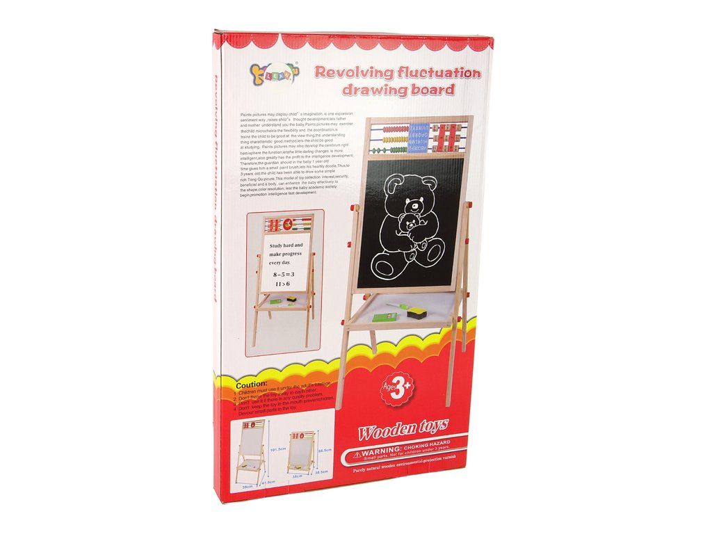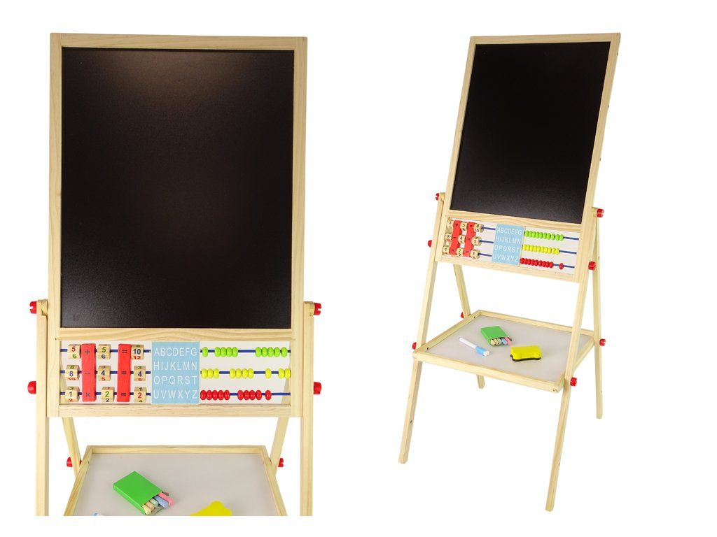 Tato oboustranná dětská tabule vyrobena z dřeva je ideální již od tří let věku. Je široce rozmístěná na nohách, což zajistí stabilitu a bezpečnost během hry. Pod tabulí se nachází polička pro křídu a houbičku. Jedna strana je klasická černá křídová tabule, na kterou můžete psát a kreslit křídou v několika barvách. Její povrch se jednoduše smývá pomocí houbičky z balení. Na druhé straně je magnetická bílá tabule.