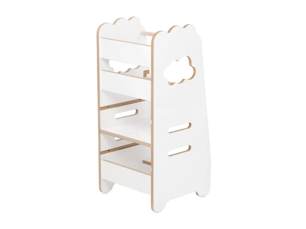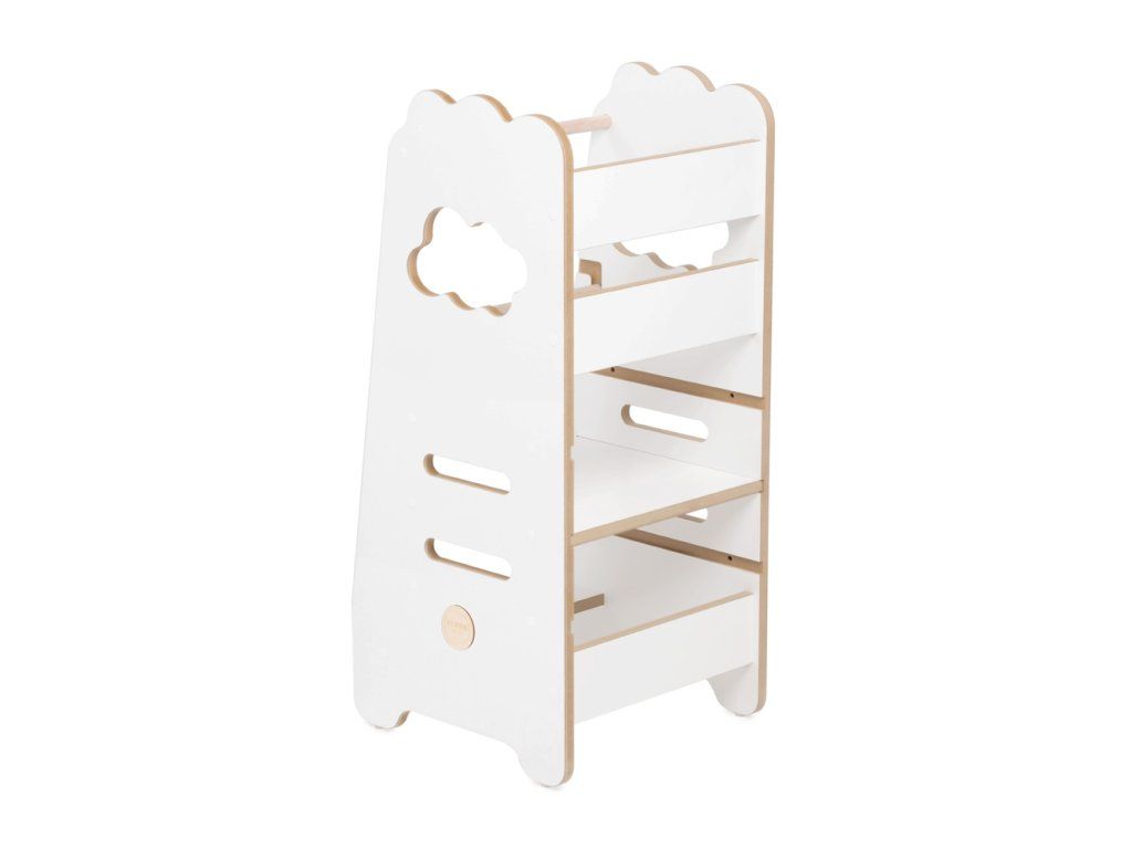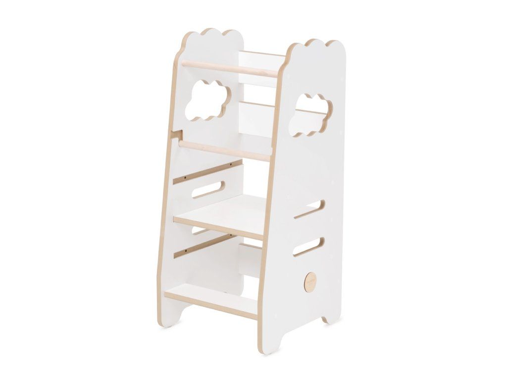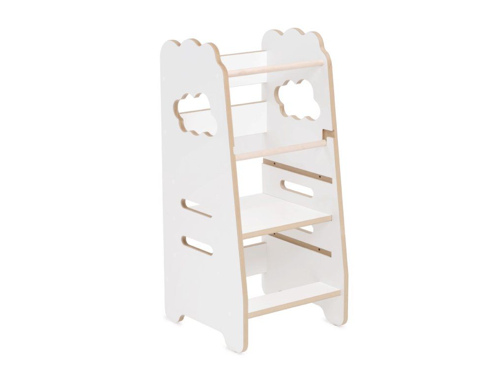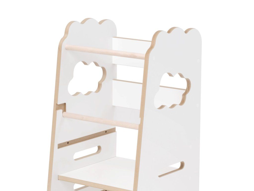 Dřevěná učící věž / Kuchyňský pomocník 3 nastavení výšky, bílá, s motivem mráčku
