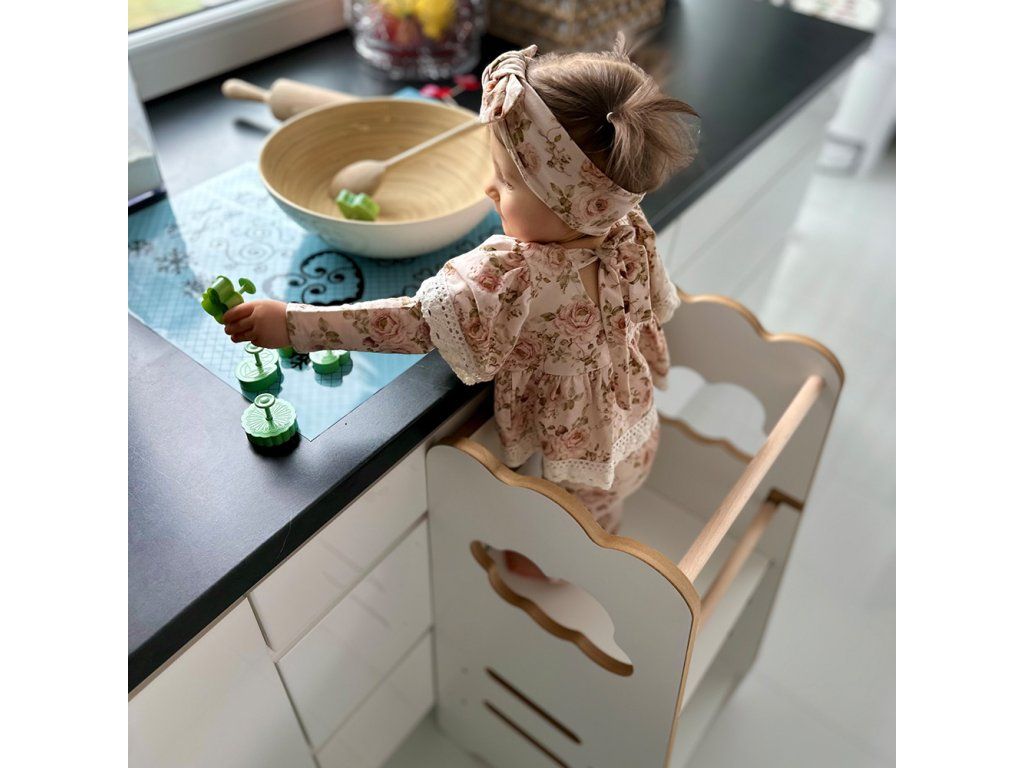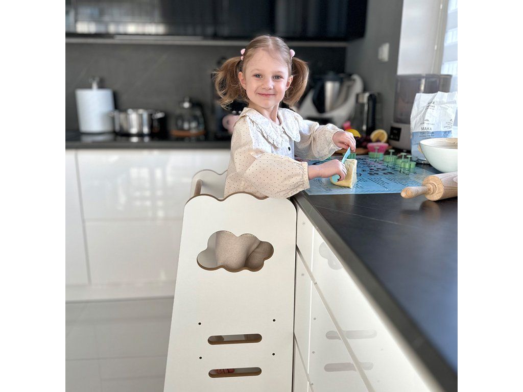 Nechte své dítě objevit radost ze společného vaření s dětským kuchyňským pomocníkem od PLUSH NEST! Tento moderní kuchyňský pomocník v podobě oblaku, vyrobený z pevné MDF, zaujme elegantním bílým povrchem, který se dokonale hodí do jakékoliv kuchyně. Jeho robustní provedení a promyšlené detaily, jako praktické výřezy a zaoblené hrany, zaručují bezpečnost a pohodlí při každodenních kuchyňských činnostech.