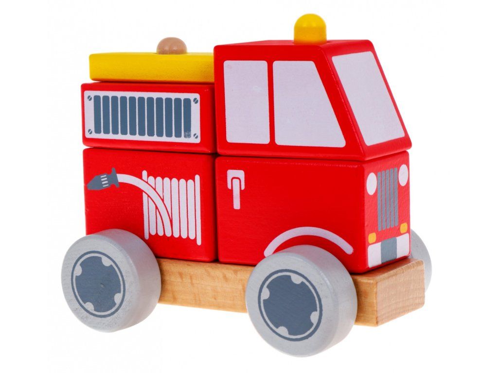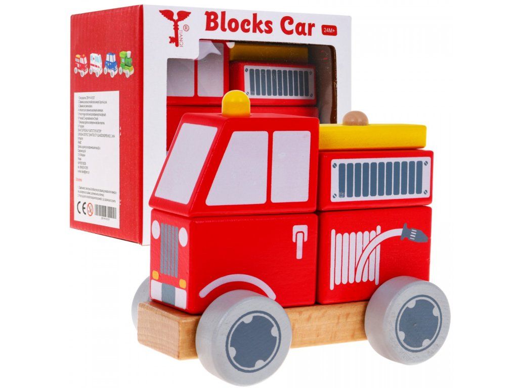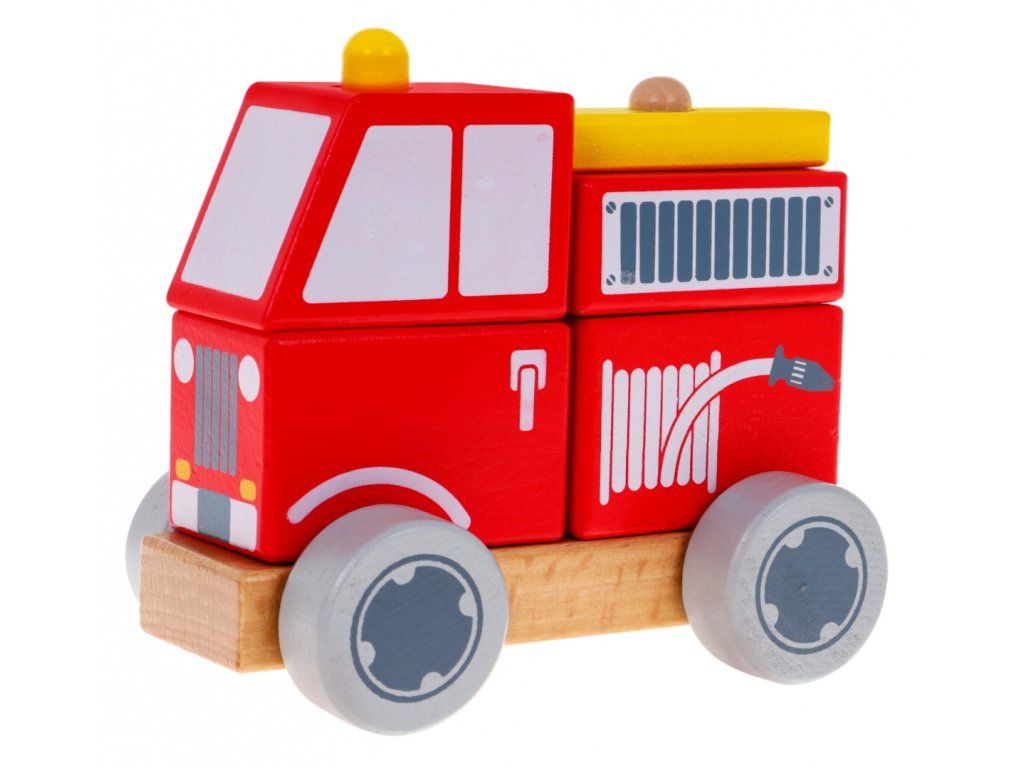 Dřevěné autíčko hasiči se skládá ze základny a čtyř kostek. K základně jsou připevněné čtyři pohyblivá kola a dva kolíky, na které se ukládají dřevěné kostky, které po složení vytvoří pohyblivé dřevěné autíčko.