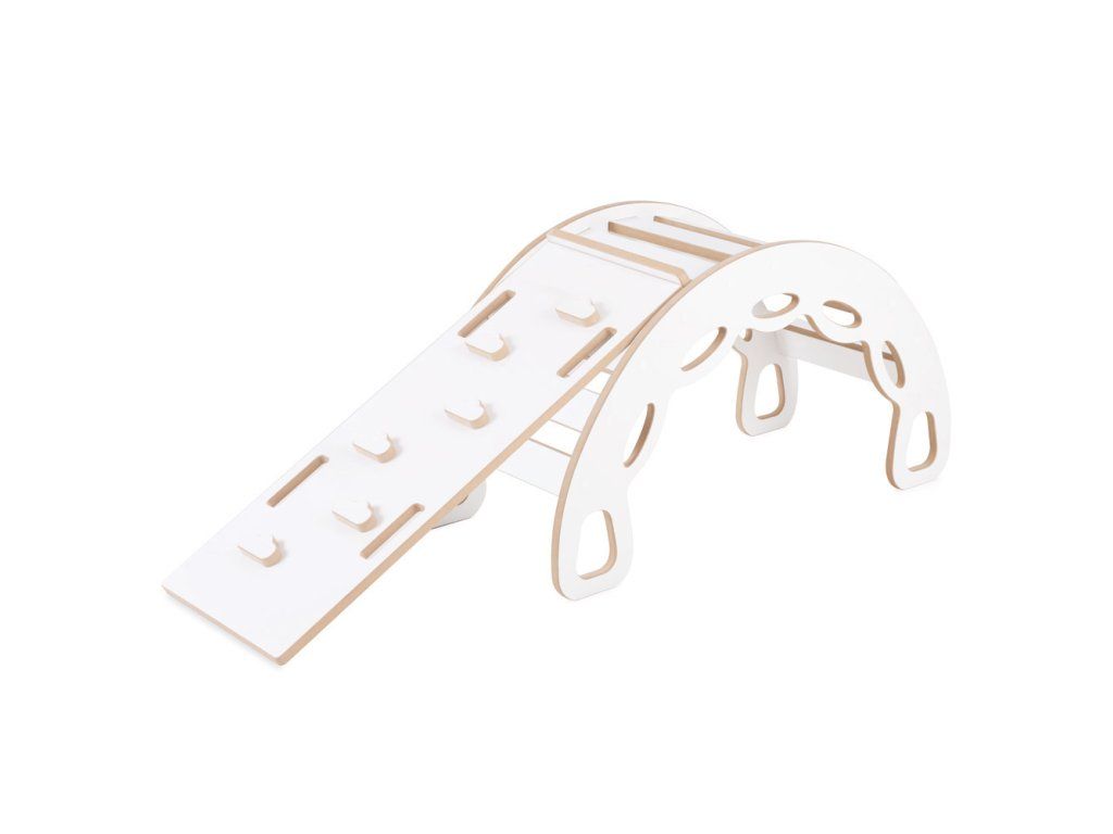 Dřevěné houpátko Mini 4v1 s lezeckou stěnou, skluzavkou a polštářem (světle béžové / bílé)