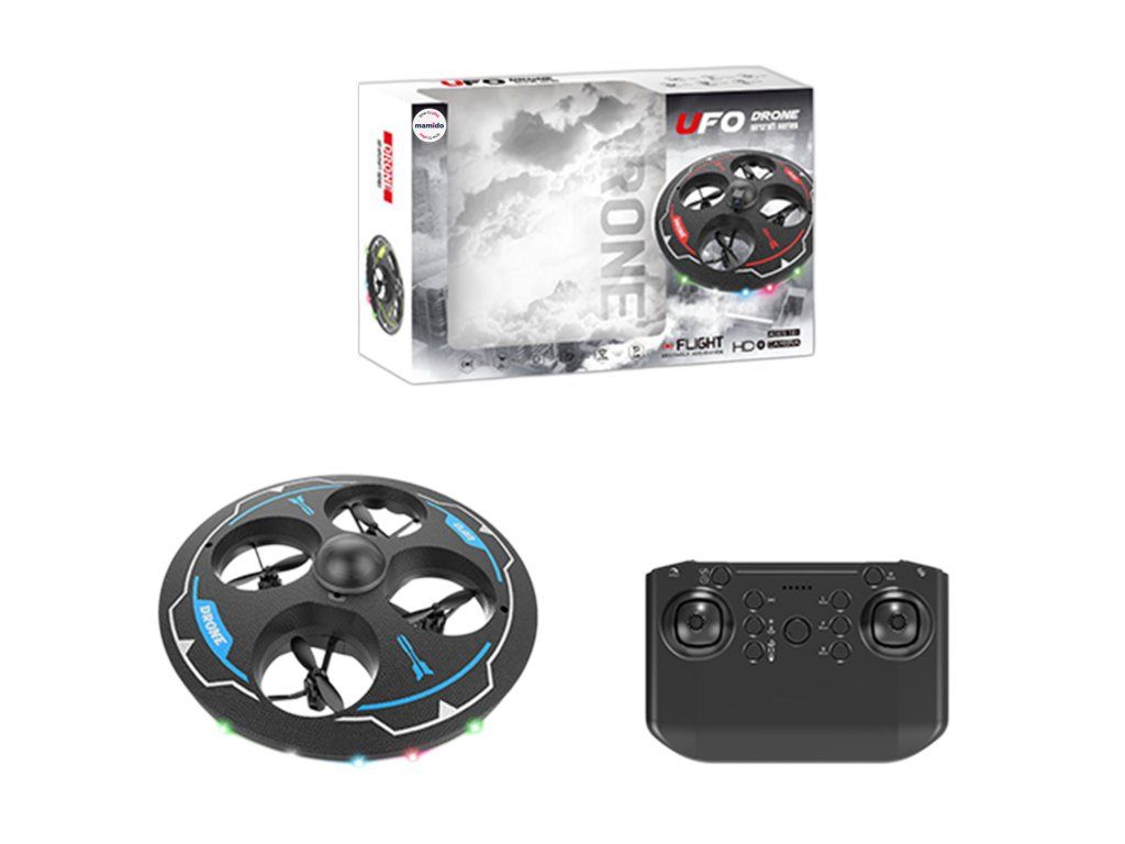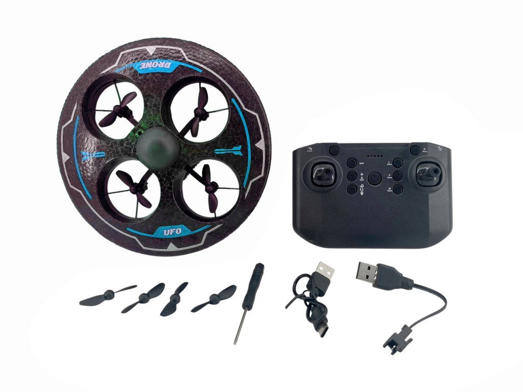 Kruhový design připomínající UFO, čtyři vrtule ukryté uvnitř ochranného rámu – ideální pro bezpečné létání doma i venku. Ovládání je řešeno pomocí dálkového ovladače, dron je stabilní, snadno ovladatelný a díky LED světýlkům efektně svítí při letu. Skvělý pro začátečníky, děti i jako zábavná RC hračka na odpolední hraní.