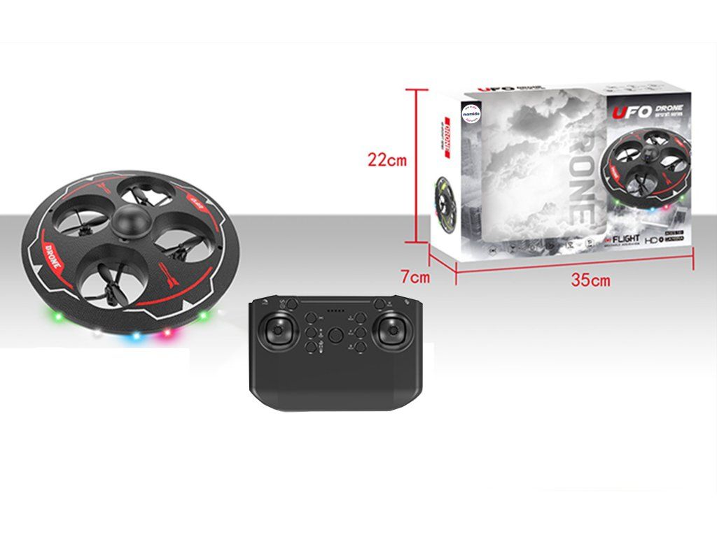 Kruhový design připomínající UFO, čtyři vrtule ukryté uvnitř ochranného rámu – ideální pro bezpečné létání doma i venku. Ovládání je řešeno pomocí dálkového ovladače, dron je stabilní, snadno ovladatelný a díky LED světýlkům efektně svítí při letu. Skvělý pro začátečníky, děti i jako zábavná RC hračka na odpolední hraní.