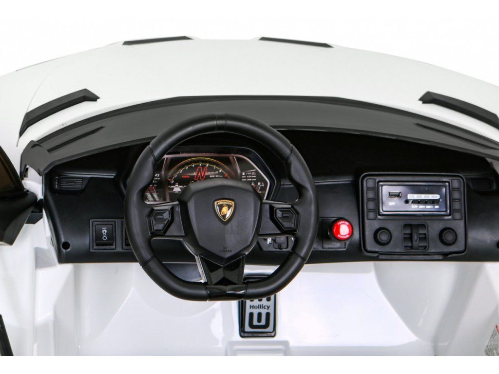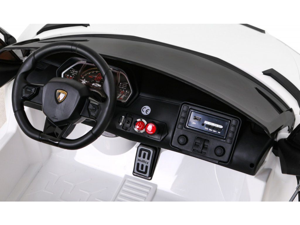 Dětské elektrické autíčko licencované společností Lamborghini je vybaveno exkluzivní sedačkou z ekologické kůže, hudebním panelem se vstupy MP3, USB, tlačítky s předem nahranými melodiemi a předními i zadními LED světly. Při startování uslyšíte charakteristické zvuky motoru.
