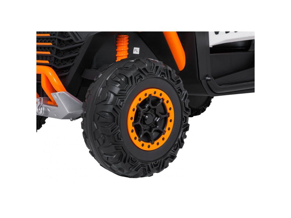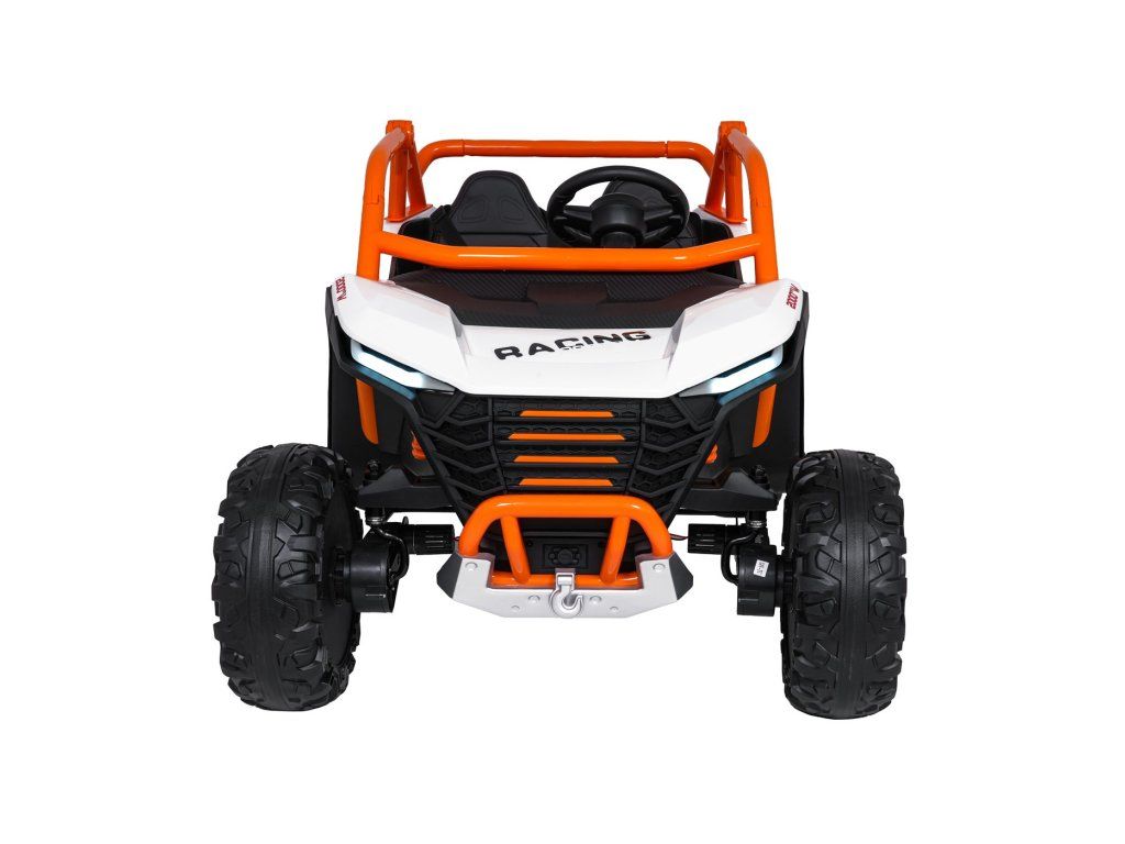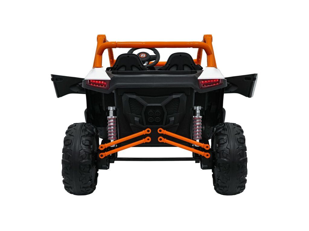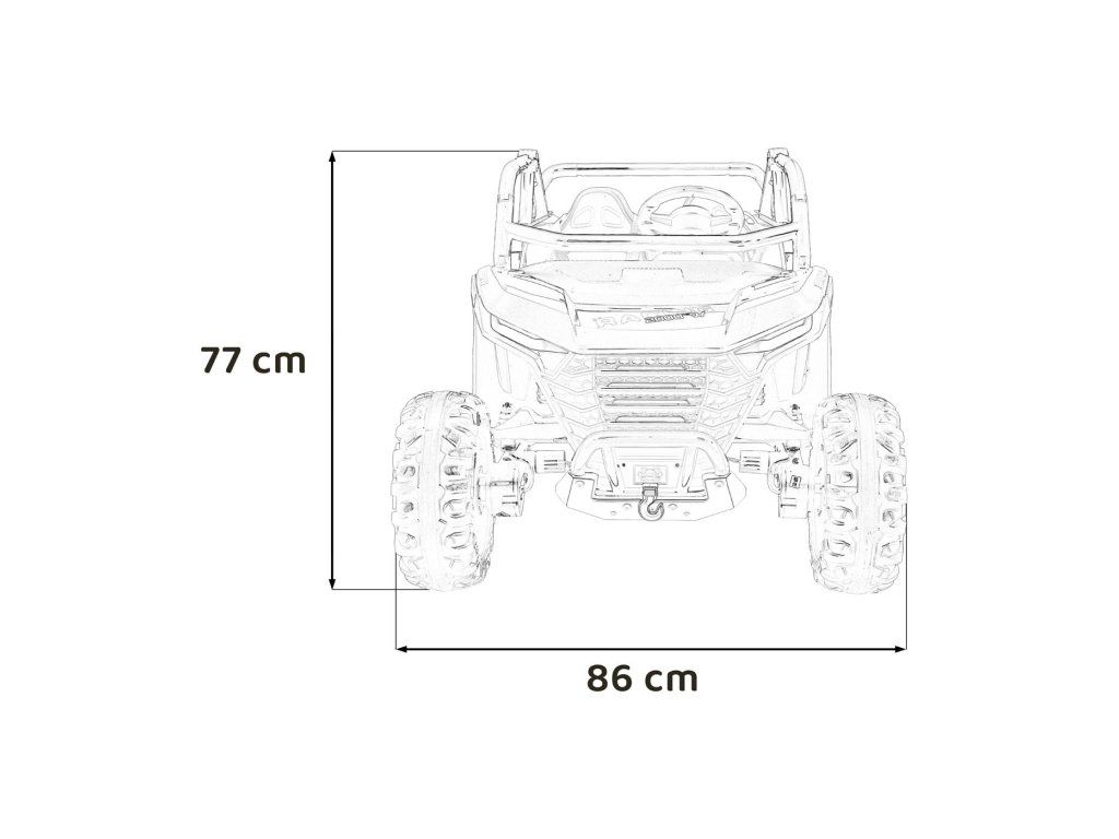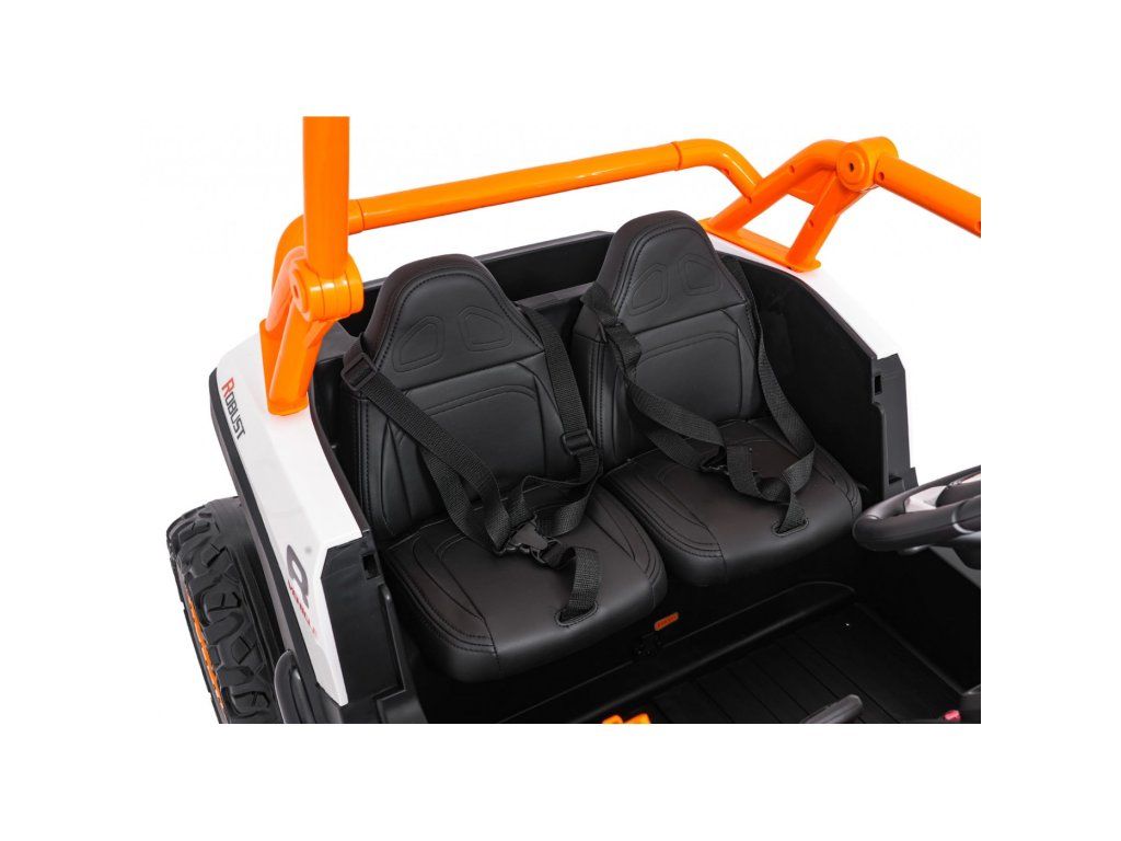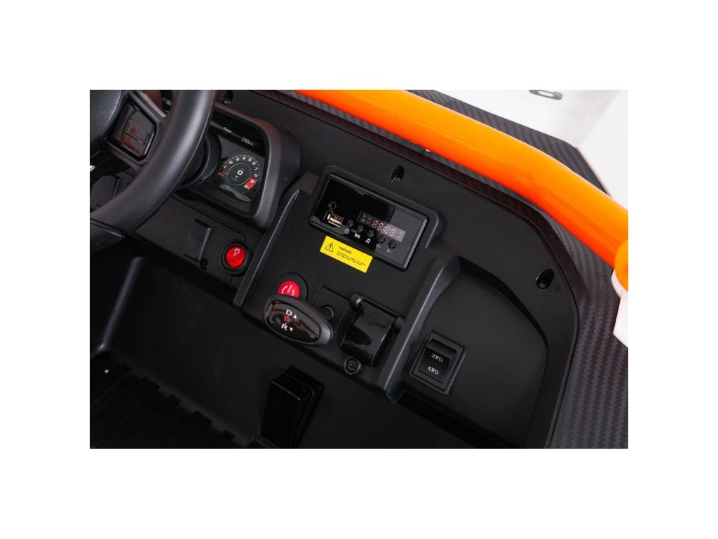 Dvě samostatné sedačky potažené ekokůží jsou vybaveny bezpečnostními pásy a umožňují jízdu dvěma dětem současně. Otevíratelné dveře s bezpečnostní pojistkou zajišťují snadné a bezpečné nastupování. LED světla vpředu i vzadu, realistické zvuky motoru a další audio efekty přinášejí autentický zážitek z jízdy. Multimediální panel umožňuje připojení přes USB, AUX i MP3, nechybí ani FM rádio a ovládací tlačítka na volantu.