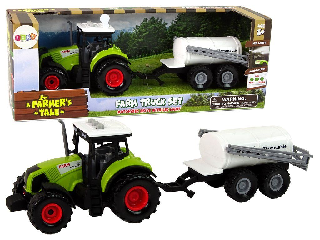 Převládající barvou hračky je zelená, kterou si s tímto typem vozidla spojujeme. Součástí sady je traktor a přívěs, což dětem zpestří hru. Samotný traktor má možnost jízdy a vydává charakteristické zvuky. Zadní kola díky třecímu pohonu umožňují vozidlu pohyb vpřed nebo vzad, podle toho, co preferujete. Z hlediska zvukových projevů má traktor 3 tlačítka na střeše. Tato tlačítka vydávají zvuky, jako je couvání, troubení a startování. Abyste zvuky slyšeli, je třeba vytáhnout bílou plastovou pojistku.
