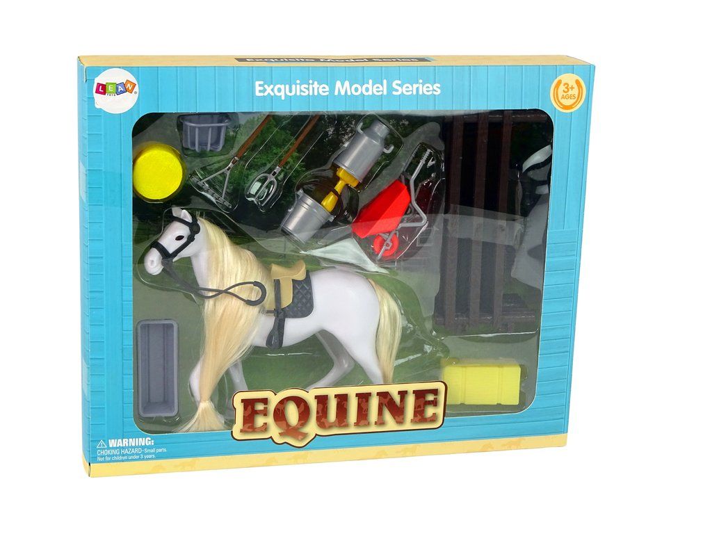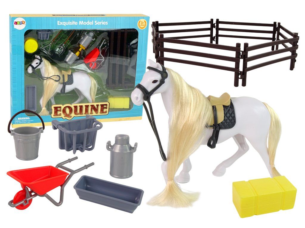 Sada se skládá z figurky koně s dlouhou hřívou, která je ideální pro česání a zaplétání. Kromě toho sada obsahuje doplňky nezbytné pro každodenní život a udržování pořádku ve stáji, jako je trakař a hrábě. To však není vše, musíte se postarat o to, aby měl kůň co jíst a pít, k tomu budete potřebovat napáječky a seno. Místo, kde budou mít koně svůj výběh, označíte speciálním plotem.